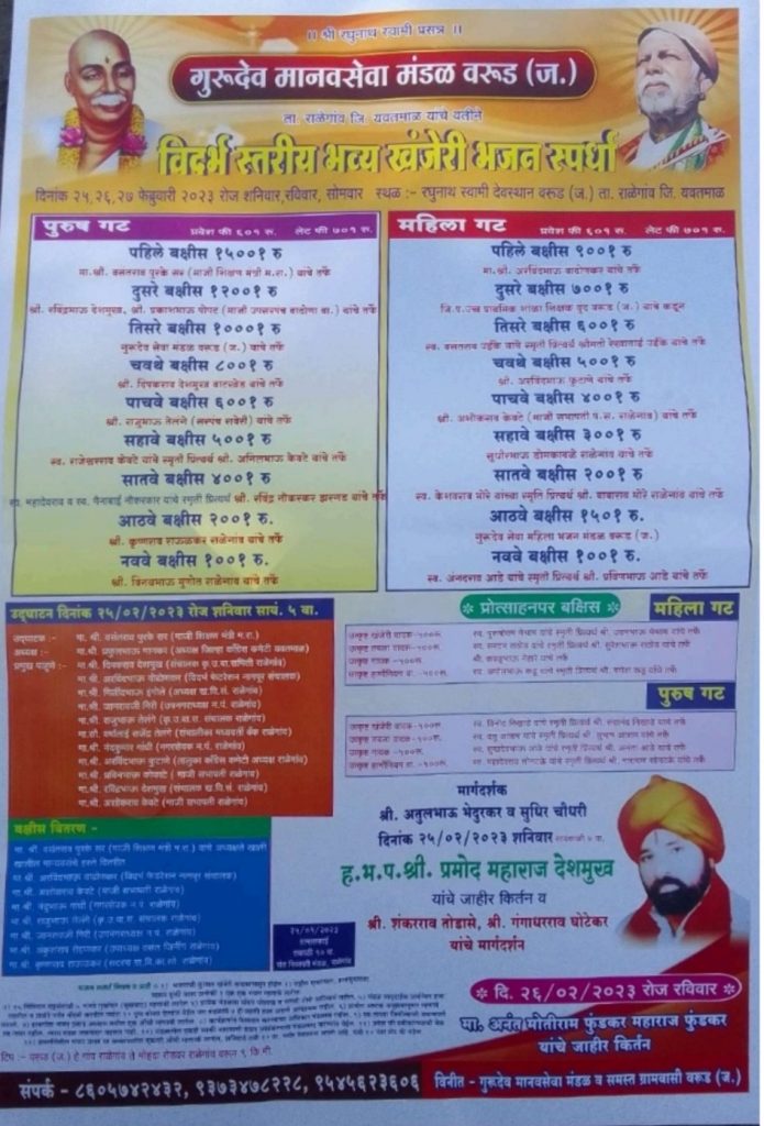 राळेगाव तालुक्यातील वरूड जहाँगीर येथे गुरूदेव मानवसेवा मंडळ वरूड ज. यांच्या वतीने विदर्भ स्तरीय भव्य खंजेरी भजन स्पर्धेचे आयोजन करण्यात आले असून पुरूष गटांसाठी पहिले बक्षीस 15001 रूपये वसंत पुरके,माजी शिक्षणमंत्री यांचे कडून, दुसरे बक्षीस 12001 रूपये रविंद्र देशमुख व प्रकाश पोपट यांचे कडून,तिसरे बक्षीस 10001 रूपये गुरूदेव सेवा मंडळाकडून,चौथे बक्षीस 8001 रूपये दिपक देशमुख, पाचवे बक्षीस 6001 रूपये राजेंद्र तेलंगे,सहावे बक्षीस अनिल केवटे,सातवे बक्षीस 4001 रविंद्र नौकरकार,आठवे बक्षीस 2001 रूपये कृष्णराव राहूळकर,नववे बक्षीस 1001 विनय मुनोत यांचेकडून देण्यात येणार असून महिला गटांसाठी पहिले बक्षीस 9001रूपये अरविंद वाढोणकर,दुसरे बक्षीस 7001रूपये जिल्हा परिषद उच्च प्राथमिक शाळा वरूड,तिसरे बक्षीस 6001रेखाताई उईके,चौथे बक्षीस 5001रूपये अरविंद फुटाणे,पाचवे बक्षीस 4001रूपये अशोकराव केवटे,सहावे बक्षीस 3001रूपये सुधीर डोमकावळे,सातवे बक्षीस 2001रूपये बाबाराव भोरे,आठवे बक्षीस 1501 रूपये गुरूदेव सेवा महिला भजन मंडळ वरूड जहाँ,नववे बक्षीस 1001रूपये प्रविण आडे यांचे कडून देण्यात येणार असून ह्या स्पर्धा दिनांक 25,26,27, फेब्रुवारीला घेण्यात येणार असून या कार्यक्रमाचे उद्घाटक वसंत पुरके माजी शिक्षणमंत्री, अध्यक्ष प्रफुल्ल मानकर, अध्यक्ष जिल्हा काँग्रेस कमेटी यवतमाळ जिल्हा,तर प्रमुख पाहुणे दिपक देशमुख, अरविंद वाढोणकर, मिलिंद इंगोले, जानराव गिरी, राजेंद्र तेलंगे,वर्षाताई तेलंगे, नंदकुमार गांधी, अरविंद फुटाणे, प्रविण कोकाटे, रविंद्र देशमुख, अशोकराव केवटे यांच्या उपस्थितीत पार असून दिनांक 25/2/2023 ला सायंकाळी ह.भ.प.प्रमोद महाराज देशमुख यांच्या जाहीर किर्तनाचा कार्यक्रम आयोजित करण्यात आला असल्याचे गुरूदेव सेवा मंडळाचे उत्तम भोरे यांनी प्रसिद्धी पत्रकाद्वारे कळविले आहे.