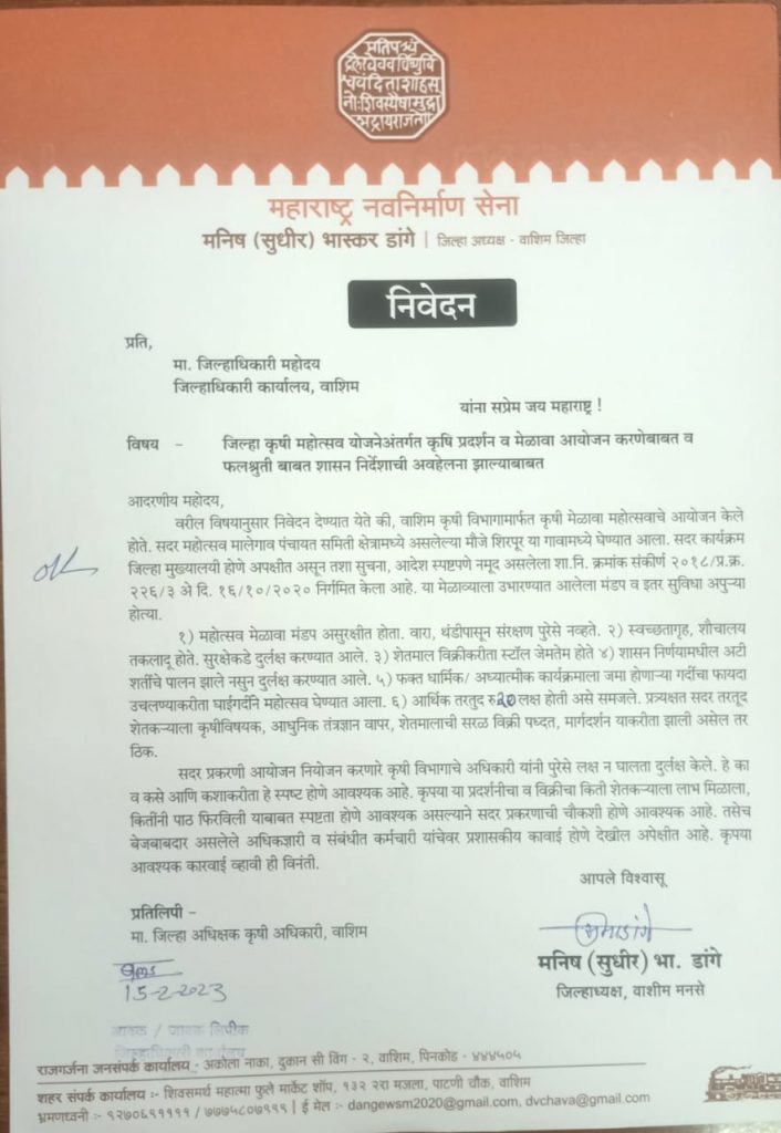 निवेदनात नमूद आहे की, वाशिम कृषी विभागामार्फत कृषी मेळावा महोत्सवाचे आयोजन केले होते. सदर महोत्सव मालेगाव पंचायत समिती क्षेत्रामध्ये असलेल्या मौजे शिरपूर या गावामध्ये घेण्यात आला. सदर कार्यक्रम जिल्हा मुख्यालयी होणे अपक्षीत असून तशा सुचना, आदेश स्पष्टपणे नमूद असलेला शा.नि. क्रमांक संकीर्ण २०१८/प्र.क्र. २२६/३ ए दि. १६/१०/२०२० निर्गमित केला आहे. या मेळाव्याला उभारण्यात आलेला मंडप व इतर सुविधा अपुर्या होत्या. महोत्सव मेळावा मंडप असुरक्षीत होता. वारा, थंडीपासून संरक्षण पुरेसे नव्हते. स्वच्छतागृह, शौचालय तकलादू होते. सुरक्षेकडे दुर्लक्ष करण्यात आले. शेतमाल विक्रीकरीता स्टॉल जेमतेम होते. शासन निर्णयामधील अटी शर्तीचे पालन झाले नसुन दुर्लक्ष करण्यात आले. फक्त धार्मिक/ अध्यात्मीक कार्यक्रमाला जमा होणार्या गर्दीचा फायदा उचलण्याकरीता घाईगर्दीने महोत्सव घेण्यात आला. आर्थिक तरतुद रु.२० लक्ष होती असे समजले. प्रत्र्यक्षत सदर तरतूद शेतकर्याला कृषीविषयक, आधुनिक तंत्रज्ञान वापर, शेतमालाची सरळ विक्री पध्दत, मार्गदर्शन याकरीता होती. सदर प्रकरणी आयोजन नियोजन करणारे कृषी विभागाचे अधिकारी यांनी पुरेसे लक्ष न घालता दुर्लक्ष केले. हे का व कसे आणि कशाकरीता हे स्पष्ट होणे आवश्यक आहे. कृपया या प्रदर्शनीचा व विक्रीचा किती शेतकर्याला लाभ मिळाला, कितींनी पाठ फिरविली याबाबत स्पष्टता होणे आवश्यक असल्याने सदर प्रकरणाची चौकशी होणे आवश्यक आहे. तसेच बेजबाबदार असलेले अधिकारी व संबंधीत कर्मचारी यांचेवर प्रशासकीय कावाई होणे देखील अपेक्षीत आहे. याबाबत कार्यवाही होण्याची मागणी मनसेने केली आहे.