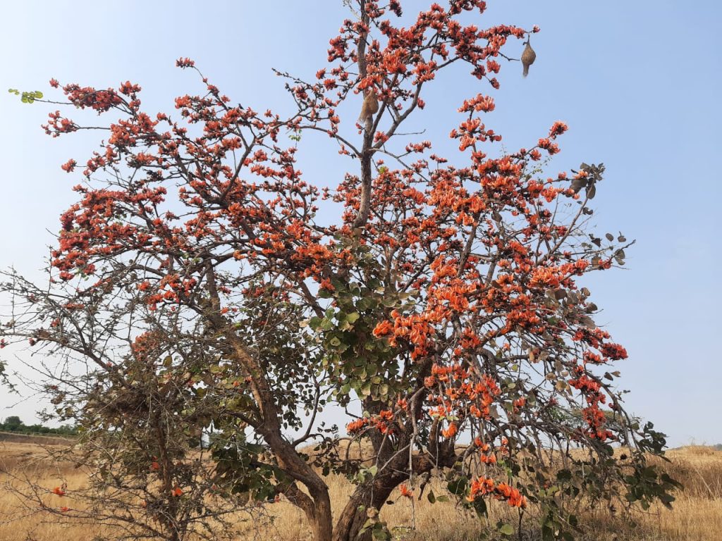 निसर्गाने नटलेल्या रानावनात डोंगरकपारी नदी नाल्यातील रोडच्या कडेला हिरवागार पानांच्या पळस वृक्षावरती केशरी रंगाची फुले सर्व सामन्यांची मनेमोहीत करत आहेत.आंब्याच्या वृक्षांना सर्व बाजूंनी मोहर लगडल्याने पिवळसर फुलांनी शेतशिवार नटले आहेत. बर्याच भागात नदीनाले तलावे तर कुठे डोंगराळ भाग असून डोंगरावरती तथा रोडच्या कडेला अनेक ठिकाणी पळसाची झाडे केशरी फुलांनी नटलेली दिसत आहे.