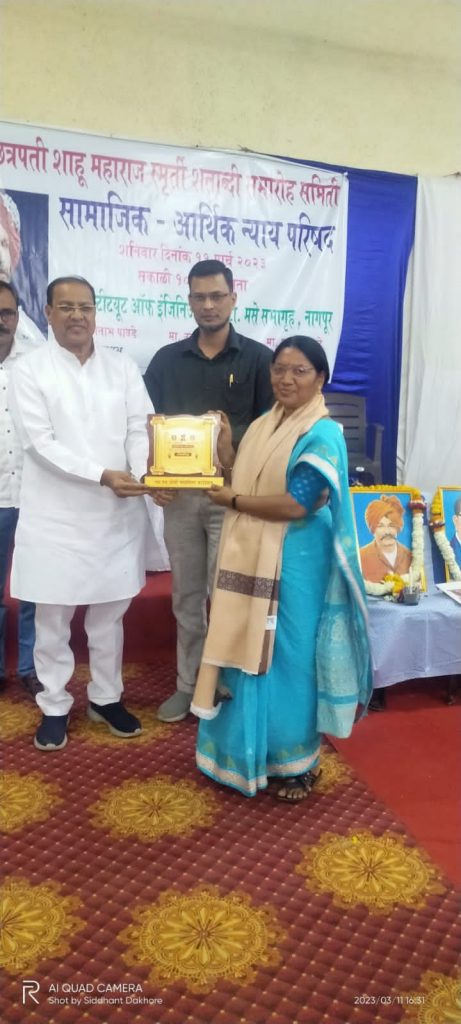 राजर्षी छत्रपती शाहू महाराज स्मृती शताब्दी समारोह समिती द्वारा आयोजित सामाजिक – आर्थिक न्याय परीषद नागपूर येथे दी.११ मार्च २३ ला परिषदेचे उद्घाटक मा. उत्तम कांबळे ज्येष्ठ पत्रकार, सुप्रसिद्ध विचारवंत नाशिक, मा. सुभाष लोमटे,सचिव एस एम जोशी सोशलिस्ट फाऊंडेशन पुणे, विलास भोंगाडे सामाजिक कार्यकर्ता यांचे उपस्थीतीत मा. ज्ञानेश्वर रक्षक व डॉ अन्वर सिद्दीकी यांचे हस्ते माधुरी खडसे – डाखोरे, सचिव प्रेरणा ग्राम विकास संस्था, राळेगाव यांना एस.एम. जोशी सोशालिस्ट फाऊंडेशन द्वारा पुरस्कार देऊन सन्मानित करण्यात आले.