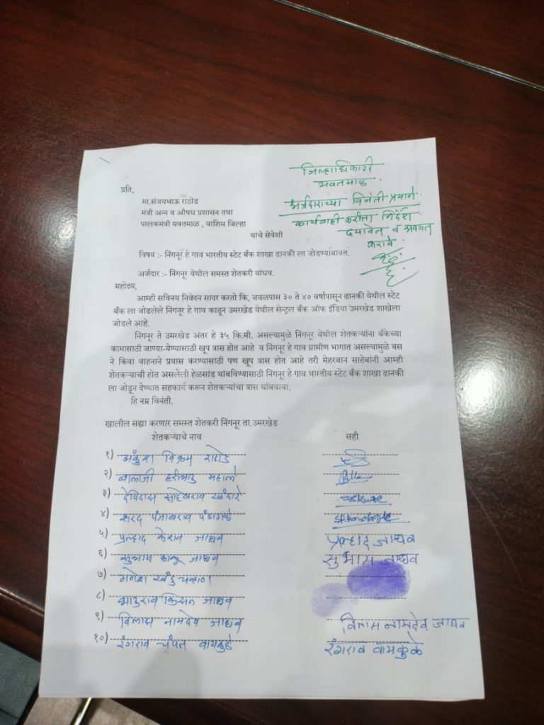 निंगनूर येतील शेतकरी ढाणकी स्टेट बँकेत सुरळीत व्यवहार सुरु असताना 35 किलोमीटर अंतरावरील सेंट्रल बँक उमरखेड शाखेला जोडल्या गेल्याने या बँकेचे व्यवहार करण्यासाठी शेतकऱ्यांची नाहक आर्थिक मानसिक व शारीरिक दगदग सहन करावी लागत असल्याने उमरखेड सेंट्रल बँक ऐवजी शेतकऱ्यांना ढाणकी स्टेट बँकेशी जोडण्यात यावे अशा आशयचे निवेदन निंगनूर येतील शेतकऱ्यानी जिल्ह्याचे पालकमंत्री संजयभाऊ राठोड यांना निवेदन दिले आहे .निंगनूर येथील शेतकऱ्यांचे सर्व व्यवहार मागील 30ते 40 वर्षापासून गावा जवळील ढाणकी शाखेत सुरळीत चालू असताना बँक प्रशासनाने सुमारे 35 किलोमीटर अंतरावर असलेल्या उमरखेड सेंट्रल बँक शाखेला निंगनूर गाव जोडले आहे त्यामुळे वाहनाची वाणवा असलेल्या या भागातून उमरखेड बँकेशी व्यव हार करताना शेतकऱ्यांना मानसिक शारीरिक व आर्थिक फटका वेळ पैशा व श्रम व्यर्थ वाया घालवावा लागत असल्याने याबाबत ज़िल्याचे पालकमंत्री संजयभाऊ राठोड यांनी शेतकऱ्यांची होणारी ससेहोलपत दूर करण्यासाठी ढाणकी स्टेट बँकेचे व्यवहार पूर्ववत करावे अशा आशायचे निवेदन शेतकरी चिंतागराव कदम शिवसेना सहसपंर्क प्रमुख तथा माजी जि. प. सदस्य यवतमाळ प्रवीण पाटील मीराशे शिवसेना तालूका प्रमुख तथा माजी सभापती पंचायत समिती उमरखेड बालाजी महाले माजी सरपंच निंगनूर अंकुश राठोड माजी उपसरपंच प्रमोद जयसवाल दीपक खंदारे शरद पंडागळे. विलास तुळशीराम राठोड प्रेस रिपोटर प्रल्हाद केशव जाधव नाईक व कैलास राठोड चिंतागराव कदम प्रविण पाटील मिरसे यांच्या हस्ते निवेदन पत्र देण्यात आले.