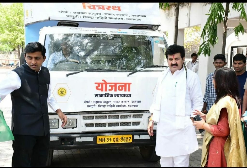 सामाजिक न्याय विभागाच्या विविध योजनांची प्रसिद्धी आणि प्रचार करण्यासाठी जिल्हा माहिती कार्यालयाच्यावतीने शासकीय योजनाची जत्रा हा चित्ररथ तयार करण्यात आला. आज यवतमाळ येथे या चित्ररथला राज्याचे अन्न व औषध प्रशासन मंत्री तथा यवतमाळ व वाशीम जिल्ह्याचे पालकमंत्री माननीय संजय भाऊ राठोड यांनी हिरवा झेंडा दाखवूनमार्गस्त केले .यावेळी माननीय जिल्हाधिकारी अमोल येडगे साहेब,निवासी उपजिल्हा अधीकारी ललितकुमार यांच्यासह अनेक मान्यवर उपस्थित होते अनुसूचित जातीच्या नागरिकांसाठी असलेल्या शासकीय योजना जलद आणि शेवटच्या व्यक्ती पर्यत पोहोचवण्यासाठी शासकीय ्योजनाची जत्रा हा उपक्रम राज्यभर सूरू करण्यात आलाय.