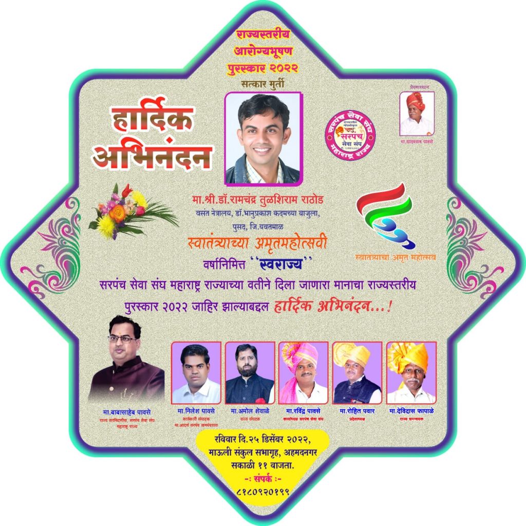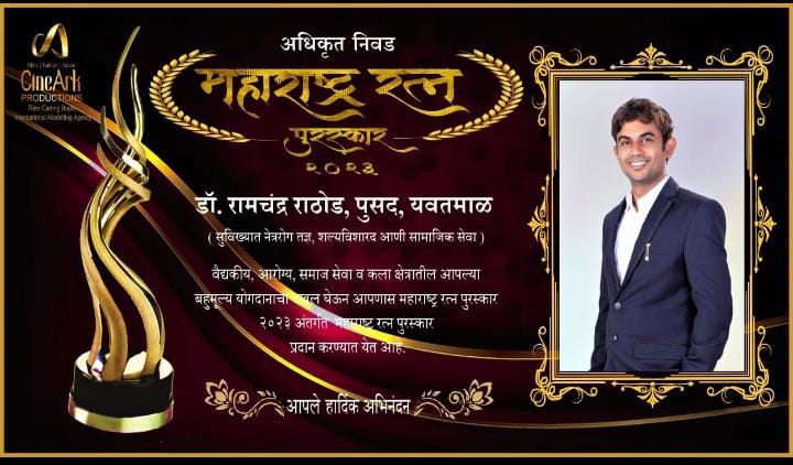 पुसद येथील वसंत नेत्रालय चे सर्वे सर्वा Dr. रामचंद्र राठोड MS नेत्र तज्ञ व उदगम फाउंडेशन पुसदचे उपाध्यक्ष यांनी वैद्यकीय, आरोग्य, व कला क्षेत्रातील समाज सेवे बद्दल अनेक संस्था व फेडरेशन द्वारा वेगवेगळे पुरस्काने सन्मानित Dr. राम यांना त्यांच्या वरील कार्याची दखल घेऊन सर्व प्रथम 11 सप्टेंबर 2022 रोजी स्वराज्याच्या अमृत महोत्सव निमित्त महात्मा गांधी आदर्श राज्य स्तरीय पुरस्कार 17 डिसेम्बर राज्य स्तरीय आरोग्य भूषण पुरस्कार,25 डिसेंबर आरोग्य क्षेत्रातील योगदाना बद्दल सरपंच सेवा संघ महाराष्ट्र राज्य द्वारा राज्य स्तरीय पुरस्कार,11जानेवारी बंजारा कशी पोहरादेवी येथे धर्म गुरु तपस्वी संत रामराव महाराज बंजारा समाज विकास फेडरेशन भारत द्वारा वरील कार्य बद्दल बंजारा रत्न पुरस्काराने सन्मानित व आता वैध्यकी य जगतातून समाज सेवा केल्या बद्दल महाराष्ट्र रत्न पुरस्काराने सन्मानित होणार असून त्यांच्या वरील पुरस्कारासाठी निवड झाल्याने सर्व स्तरातून त्यांच्यावर कौतुकांच वर्षाव होत आहे.