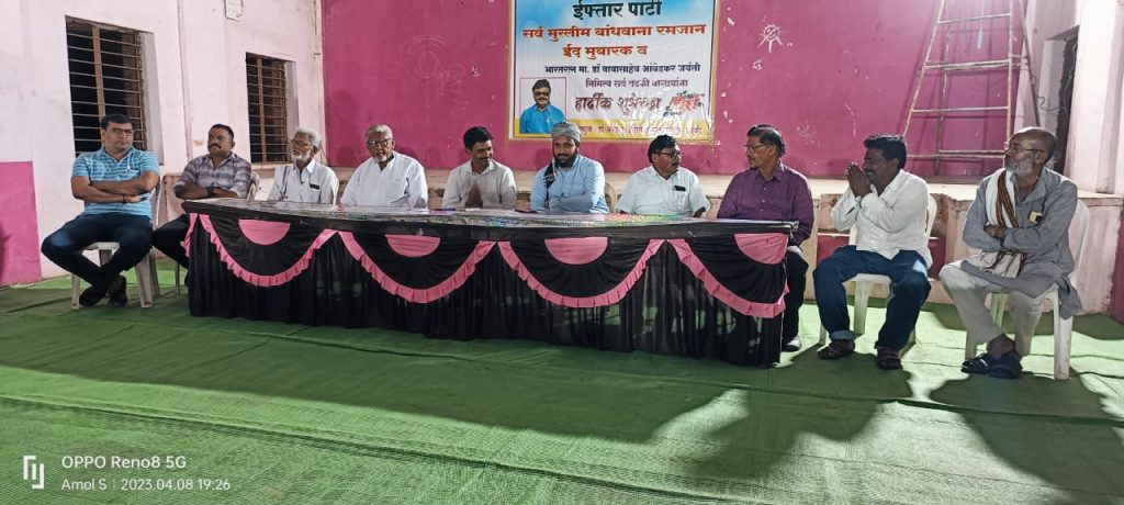यावेळी प्रमुख पाहुणे म्हणून रसूलभाई शेख,कार्यक्रमाचे अध्यक्ष ठाणेदार विजय महाले, तसेच जमा मस्जिद काजी मौलाना नदीम खान,माजी सरपंच डॉ नरेंद्र इंगोले,व्हाय.एफ सय्यद, किशोर पवार,त्रंबकराव महाजन, पत्रकार अमोल सांगानी,दीपक पवार,रामुजी भोयर हे व्यासपीठावर उपस्थित होते.ह्यावेळी मानवता हा एकच धर्म आहे या भावनेतून सर्वांनी एकमेकांचे सण उत्सव एकत्र येऊन साजरे करावेत त्यामुळे प्रत्येकाच्या मनात एकोप्याची भावना निर्माण होऊन जातीय सलोखा राखण्यास मोठी मदत होईल असे ठाणेदार विजय महाले यांनी इफ्तार पार्टी दरम्यान उपस्थितांना संबोधित केले.तसेच या इफ्तार पार्टीत माजी सरपंच डॉ नरेंद्र इंगोले, त्रंबकरावजी महाजन, किशोर पवार यांनी आपले मनोगत व्यक्त करताना सर्व मुस्लिम बांधवांना रमजान ईदच्या शुभेच्छा दिल्या. या कार्यक्रमाचे सूत्रसंचालन सामाजिक कार्यकर्ते वैकुंठराव मांडेकर यांनी केले तर या कार्यक्रमाचे आयोजन डॉ नरेंद्र इंगोले मित्र परिवाराचे हेमंत कडू, शरद सराटे,वैभव इंगोले,सौरभ इंगोले,बंटी तेलतुंबडे,रुद्रेश केराम,आशिष केराम,गणेश केराम,गौरव उधार,अमोल राऊत,अथर्व बोरपे, तन्मय पिपराडे,आदर्श जगताप,यांनी केले होते.