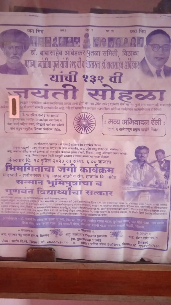 संविधान निर्माते भारत रत्न Dr. बाबासाहेब आंबेडकर यांच्या जयंती निमित्य बाबासाहेब पुतळा समिती विठाळा व रमाई महिला मंडळ विठाळा यांच्या वतीने Dr. बाबासाहेब आंबेडकर यांच्या जयंती निमित्त विठाळा येथे दि.18/4/2023रोजी प्रबोधनकार आयु. माधव वाढवे व संच हदगाव जि. नांदेड यांचा जंगी भीम गीतांचा कार्यक्रम आयोजित केले असून या कार्यक्रमा मध्ये Dr. बाबासाहेब आंबेडकर जयंती उत्सव समिती विठाळा यांच्या वतीने “सन्मान भूमिपुत्रांचा ” या मथळ्या खाली गुणवंत विध्यार्थी चा सत्कार होणार असून दि.14 एप्रिल रोजी सकाळी 8:30वाजता पंचशील ध्वजारोहन व रमाई महिला मंडळ व सिद्धार्थ नागोराव कांबळे यांचे कडून त्रीशरण पंचशील होईल व समस्त गावकरी यांच्या वतीने महामानव, भारतरत्न, विश्व भूषण, महान कायदे पंडित, संविधान निर्माते. Dr. बाबासाहेब आंबेडकर यांना विनम्र अभिवादन व पुष्पवृष्टी करण्यात येनार असून संध्याकाळी 5:30 वाजता गावातील प्रमुख मार्गाने अभिवादन रॅली काढण्यात येणार आहे वरील कार्यक्रम पार पाडण्यासाठी. नवयुवक पंचशील मंडळ, सेवालाल जयंती उत्सव मंडळ, सर्वाजनिक दुर्गा माता मंडळ, बिरसा मुंडा मंडळ, जय बालाजी मथुरा मंडळ, सार्व जनिक गणेश मंडळ विठाळा यांचा सहभाग होणार आहे