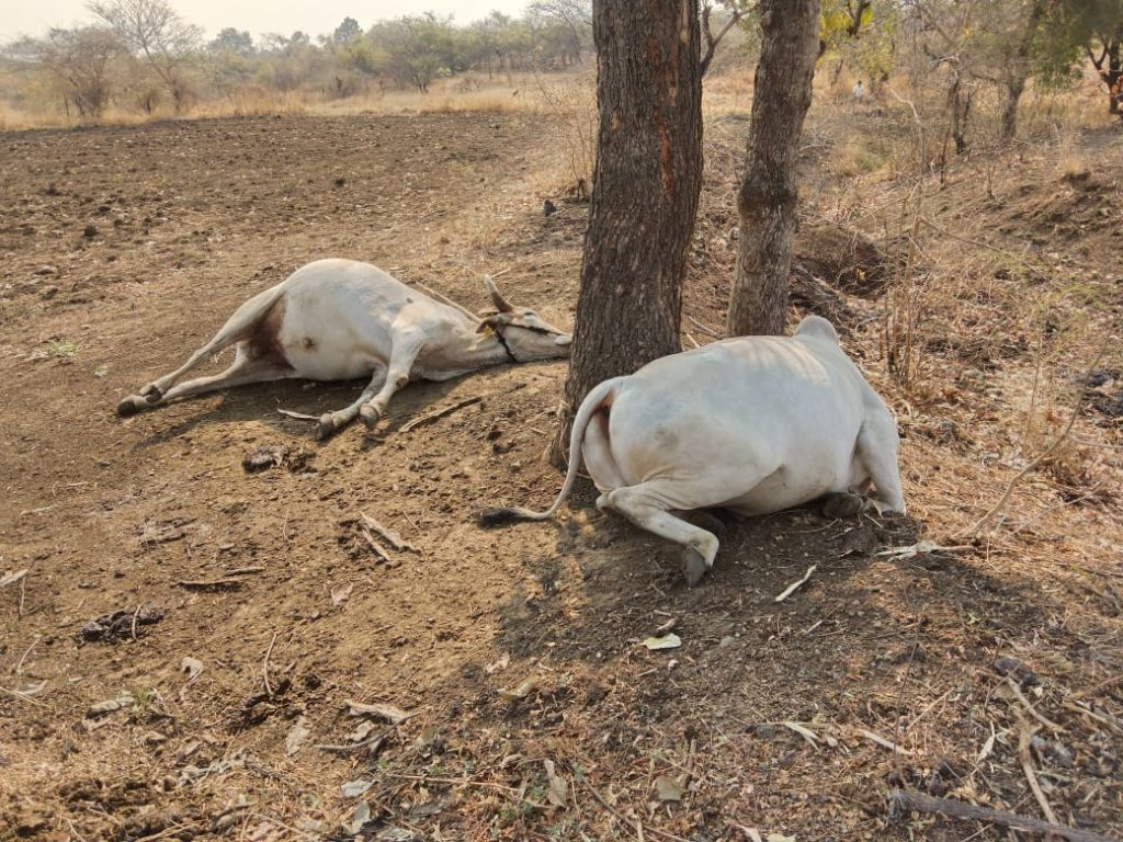 राळेगाव तालुक्यातील करंजी (सोना माता) येथे बैलाच्या अंगावर वीज पडून दोन बैल जागीच ठार झाल्याची दुर्दैवी घटना घडली आहे. सविस्तर वृत्त असे दिनांक 18 एप्रिल च्या मध्यरात्री विजाच्या कडकडासह पावसाला सुरुवात झाली होती. सदर करंजी येथील शेतकरी गजानन निखाडे शेत सर्वे नंबर 49 मध्ये नेहमीप्रमाणे आपले दोन बैल बांधून होते 18 एप्रिल च्या मध्यरात्री विजेच्या कडकडासह जोरदार पावसाला सुरुवात झाली असल्याने यामध्ये शेतकऱ्यांचे दोन्ही बैल झाडाला बांधून असता त्यांच्या अंगावर वीज पडून दोन्ही बैल जागीच ठार झाले आहे. यामध्ये या शेतकऱ्यांचे दीड ते दोन लाख रुपयांचे नुकसान झाले आहे याबाबतची तक्रार महसूल विभाग, पशुसंवर्धन व पोलीस विभाग यांच्याकडे देण्यात आली असून सदर वीज पडून मरण पावलेल्या बैलांचा पंचनामा करून नुकसान भरपाई देण्याची मागणी करंजी येथील शेतकरी गजानन निखाडे यांनी केली आहे.