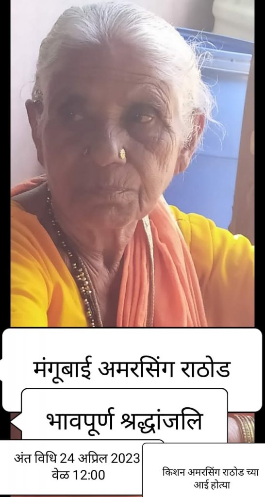 धानोरा येथील मा. सरपंच तथा पोलीस पाटील श्री किसन अमरसिंग राठोड यांची आई मंगुबाई अमरसिंग राठोड यांची काही अल्प आजाराने रात्री 9 वाजेच्या सुमारासं निधन झाले आहे तरी यांचा अंत्यविधी दिनांक 24एप्रिल 2023रोज सोमवार ठिक 12वाजता होणार आहे