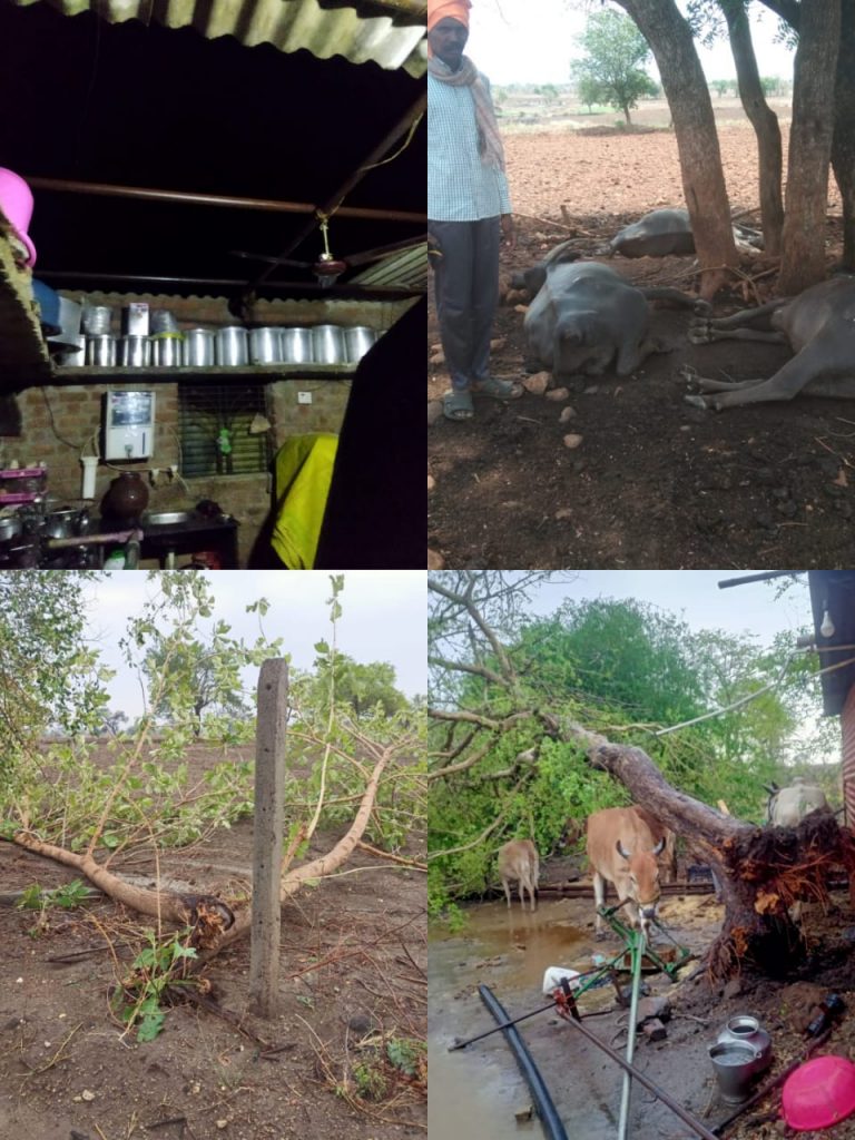 राळेगाव तालुक्यातील अनेक गावांमध्ये अकाली पावसाने मोठा कहर कल्याने तालुक्यात अनेक घरांची पडझड तर वीज पडून तीन म्हशींचा मृत्यू तर एका बकरीच्या अंगावर बाभरीचे झाड पडून मृत्यु झाल्याची दुर्दैवी घटना राळेगाव तालुक्यात घडली आहे. सविस्तर वृत्त असे राळेगाव तालुक्यातील गेल्या तीन ते चार दिवसांपासून रिधोरा, सावरखेडा, विहीरगाव, वडकी,खैरी, कोंची, सह तालुक्यात गेल्या तीन ते चार दिवसांपासून अवकाळी पावसाचा कहर सुरू असून अनेक ठिकाणी विजेच्या कडकडाटासह गारपीट, व वादळी पाऊस, पडला असुन तालुक्यात प्रचंड वादळाने घरावरील टीन पत्रे उडाली तर काही भागातील झाडे उन्मळुन पडली, व विद्युत पोल सुद्धा वाकले आहे.वडकी येथील डॉक्टर नरेंद्रजी इंगोले यांच्या शेतात बैल बांधून असल्याने सोसाट्याच्या वाऱ्याने झाडे मुळापासून उलमडून पडले परंतु यात जीवित हानी थोडक्यात टळली. सदर सावरखेडा परिसरातील सुभानहेटी येथील शेतकरी मोगरे यांच्या गोठ्यावर वीज पडून तीन म्हीशींचा जागीच मृत्यू झाला तर प्रवीण चीडाम यांच्या गोठ्यावर बाभळीचे झाड पडून एका बकरीचा जागीच मृत्यू झाला तर विहीरगाव येथील विद्युत पोल वाकली असल्याने तीन दिवसापासून वीरगाव येथील लाईट बंद आहे. तर रिधोरा येथील अविनाश बाबाराव जावादे यांच्या घराचे छप्पर उरल्याने घरातील धान्य व इतर वस्तूचे मोठ्या प्रमाणात नुकसान झाले असून सदैवाने यामध्ये जीवित हानी टळली आहे. तर वैशाली विवेक चौधरी यांच्याही घरावरील टीन पत्रे उडून गेल्याने याच्याही घरातील जीवन उपयोगी लागणाऱ्या वस्तूचे मोठ्या प्रमाणात नुकसान झाले आहे.तर वडकी येथील कीशोर पवार यांच्या घरावरील टावरचे काचे फुटली आहे. सदर तालुक्यात सावरखेडा, विहीरगाव,रिधोरा,वडकी परिसरातील संबंधित अधिकाऱ्यांनी मोक्का पाहणी करून झालेल्या नुकसानीचे पंचनामे करून नुकसान भरपाई देण्याची मागणी या परिसरातील नागरिकांची होत आहे