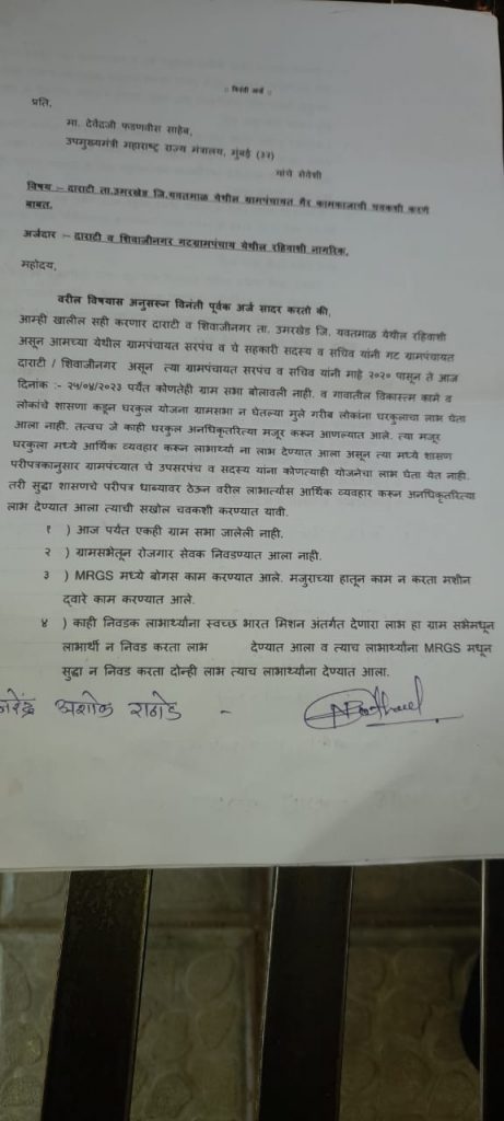 दराटी हे गाव उमरखेड तालुक्यातील ग्रामीण बंदी भागात आहे, या गावात जास्तीत जास्त नागरिक मोलमजुरी करणारे आहेत. त्यामुळे ग्रामपंचायत कार्यालय दराटी चे सरपंच उपसरपंच सचिव हे हम बोले सो कायदा करून दंडेलशाही मनमानी कारभार करत आहे,2020 पासून दि.25/04/2023, पर्यंत एकही ग्रामसभा घेण्यात आली नाही. ग्रामसभेतून रोजगार सेवक निवडण्यात आला नाही.एम आर. जी. एस. या योजना राबवत असताना बोगस व निकृष्ट कामे करण्यात आले. गोरगरीब मजुराच्या हाताने काम करून घेता मशीनच्या साह्याने कामे करण्यात आली. बिल मस्टर च्या आधारे काढण्यात आले. शासनाने गरीब मजुरांना काम मिळावं म्हणून अनेक निधीतून योजना दराटी या गावाला दिल्या मात्र जेसीबीच्या साह्याने कामे करून गरीब दिन दुबळ्या मजुरांवर उपासमारीची वेळ सरपंच व सचिव ग्रामपंचायत दराटीच्या गाव चालीवनाऱ्या प्रतिष्ठित लोकांनी आणली आह.त्यामुळे मजुराच्या हाताला काम नाही. छोट्याशा गावामध्ये रोजगाराचे कोणतेही सुविधा उपलब्ध नसल्यामुळे उपासमारीने तळपळत मरण्यापेक्षा दराटी येथील मजूर शहराकडे काम करण्याकरिता स्थलांतरित होत आहेत. घरकुल योजना खरोखर गरीब लाभार्थ्यांना न देता धाब्यावर बसून ज्याच्याकडून आर्थिक सहाय्य होईल त्यांना घरकुलाचा लाभ देण्यात येत आहे. आपल्याच हाती सत्ता आहे असा दाखवणारे उपसरपंच व सदस्य यांनी स्वतःच घरकुल चा लाभ घेतला आहे. प्रत्येक गाव विकासाच्या अनेक फंडाच्या माध्यमातून कामे करण्यात आली. मात्र दर्जा हीन मटेरियल वापरून निकृष्ट कामे करून निम्म्याच्या वर रक्कम ग्रामपंचायतचे सरपंच सचिव साहेबांनी हडप केले आहे असे गावकऱ्यांचे म्हणणे आहे.