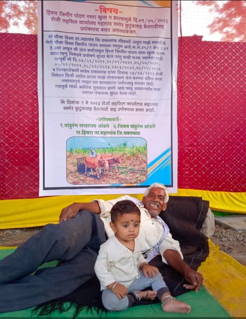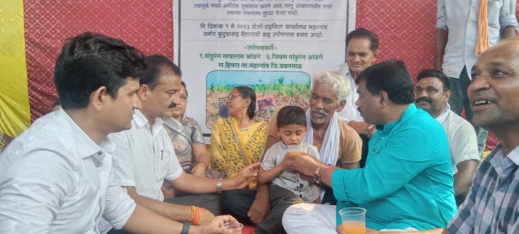 महागाव तालुक्यातील हिवरा संगम येथील शेतकरी पांडूरंग आंडगे १ मे महाराष्ट्र दिनापासून पांदन रस्त्यासाठी आमरण उपोषण करत होते परंतु प्रशासनाच्या दुर्लक्षित धोरणामुळे त्यांना तब्बल आठ दिवस उपोषण सुरू ठेवावे लागले शेवटी आज दिनांक 8 मे रोजी उपविभागीय अधिकारी व्यंकट राठोड व महसूल प्रशासनाच्या पथकाने संबंधित शेतकऱ्याच्या शेतात जाऊन पांदन रस्त्याची पाहणी करून शेतकऱ्याला एक महिन्याच्या आत पांदन रस्ता अतिक्रमण मुक्त करून देण्याचे व उभ्या असलेल्या ऊस पिकाचे नुकसान भरपाई देण्याचे तसेच या प्रकरणांमध्ये ज्या प्रशासकीय अधिकाऱ्यांनी हलगर्जी पणा केला त्या प्रशासकीय अधिकाऱ्यावर कारवाई करण्याचे आश्वासन सुद्धा दिले आहे उपोषणाची सांगता करताना उपविभागीय अधिकारी उमरखेड श्री व्यंकट राठोड .महागांव उमरखेड विधानसभेचे आमदार श्री नामदेव ससाने . जगदीश पाटील नरवाडे . अमृतराव देशमुख .