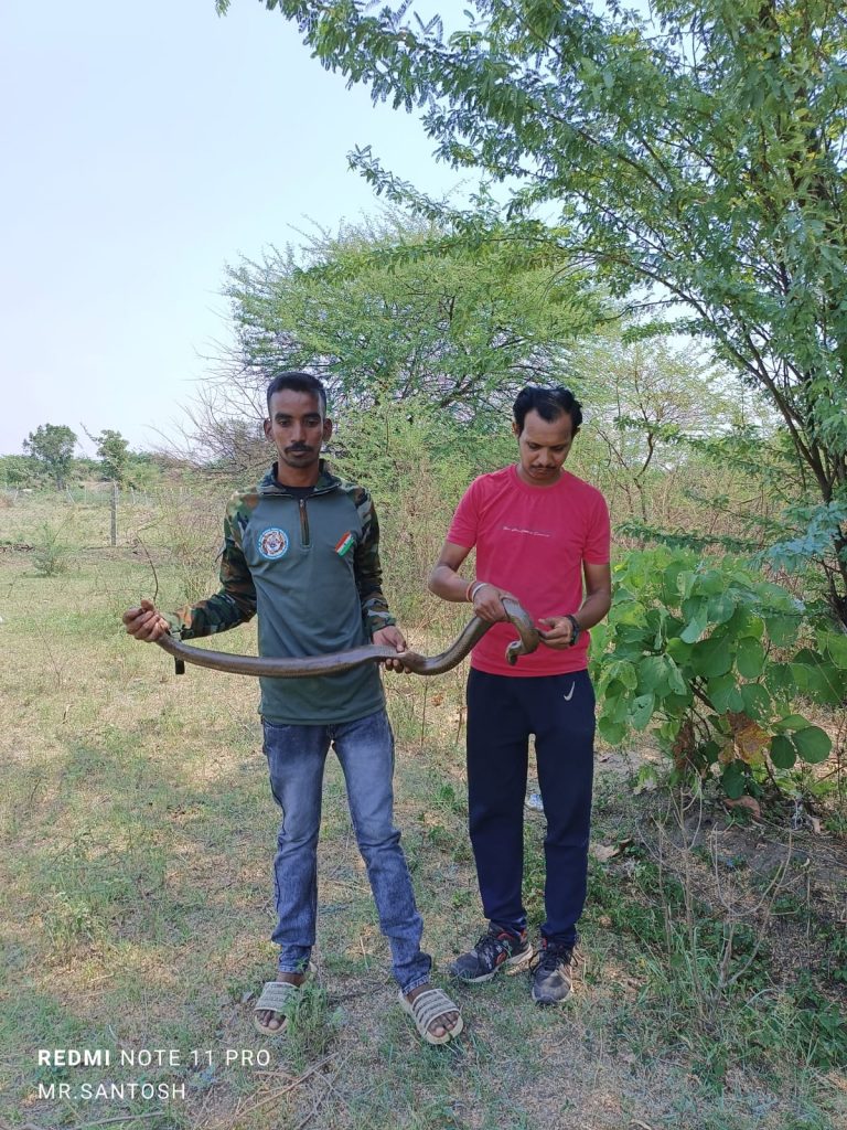 मुकुटबन येथील बेघर नगरीत काल दि. २१/०५/२०२३ रात्री १२:३० वा. प्रवीण चिटलावार यांचे घरात साप निदर्शनास आल्यास वेळेचे भान ठेऊन प्रवीण चिटलावार यांनी सर्प मित्र संतोष गुम्मुलवार व संदीप भाऊ धोटे यांना कॉल करून तात्काळ घरी बोलावून घेतलं असता तेथे मांडूळ जातीचा साप असून लांबी 4.6 फूट होता आढळून आला त्या ठिकाणी सर्प मित्र संतोष भाऊ गुम्मुलवार व संदीप भाऊ धोटे यांनी मिळून या सापाला कुठलीही इजा न होऊ देता बड्या शीताफिने पकडून याला वन रक्षक श्री कुणाल सावरकर यांच्या सहकार्यांनी वन विभाग बिट ३४ मध्ये सुरक्षित सोडण्यात आले.