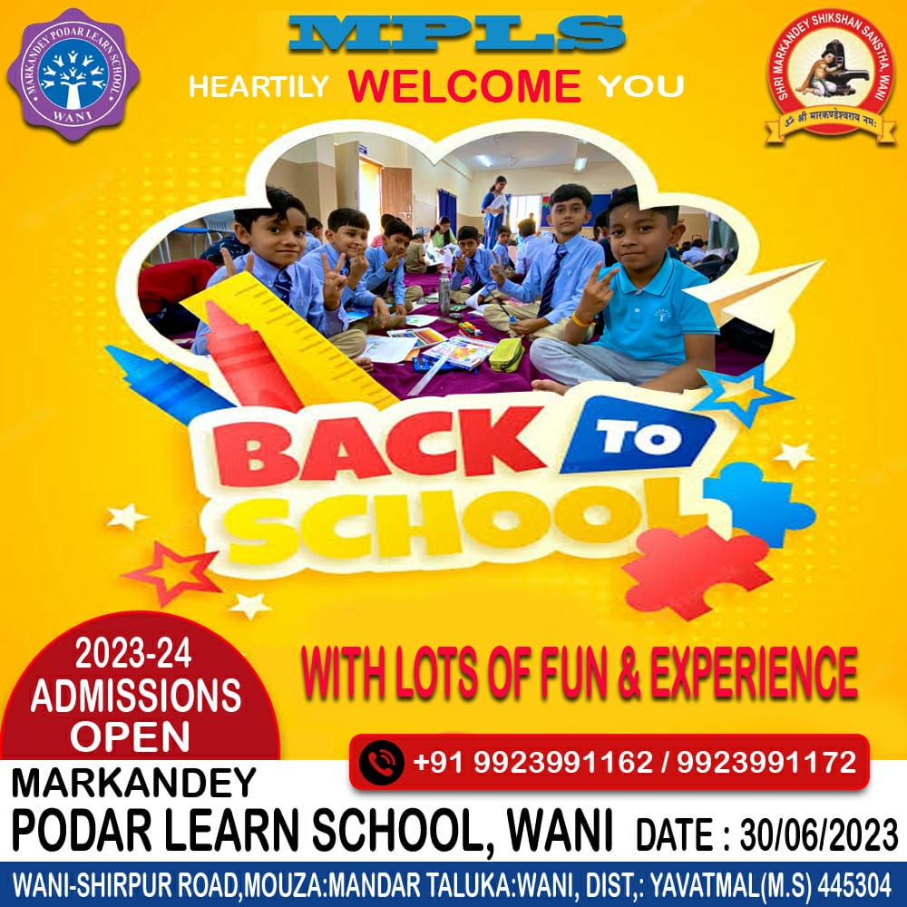 मार्कंडेय पोदार लर्न स्कूल वणी येथे विद्यार्थी यांचे आल्हाददायक वातावरणात शाळेच्या पहिल्या दिवशी कुमकुम तीलकाने, गुलाब पुष्प देऊन स्वागत करण्यात आले, शाळेच्या प्रांगणात माननिय मुख्याध्यापक श्री, अमीन नुरानी सर, संस्था अध्यक्ष माननिय श्रीमान रमेश सुंकुरवार सर,, तसेच सचिव मान, राहुल सुंकुरवार सर व सदस्या मान, सौ, प्राची सुंकुरवार मॅडम यांनी मुलांना पुष्प, गोड खाऊ देऊन स्वागत केले. उन्हाळी सुट्टी,, वार्षिक निकालानंतर पुढच्या वर्गात प्रवेश घेताना विध्यार्थीच्या चेहऱ्यावर उत्साह हा निराळाच दिसत होता स्वागताकरीता सर्व शिक्षक तथा शिक्षकेत्त्तर कर्मचारी उपस्थित होते