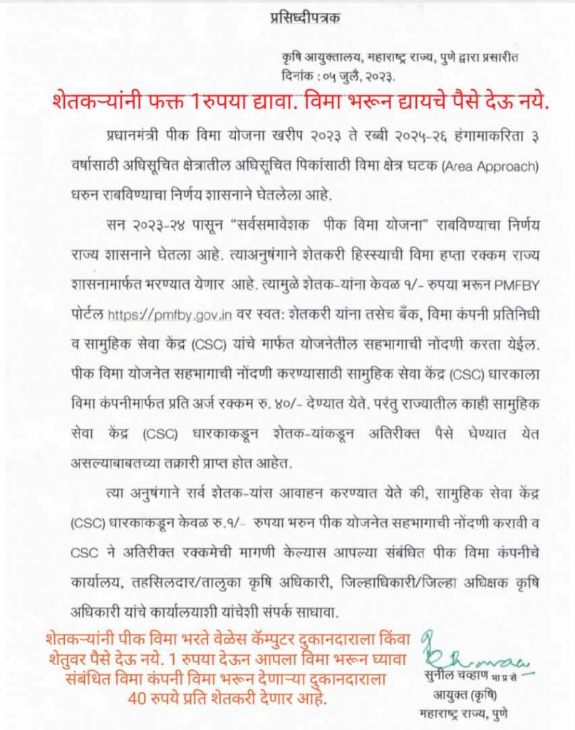 प्रधानमंत्री पीक विमा योजना खरीप सन २०२३- २४ पासून सर्वसमावेशक पीक विमा योजना राबविण्याचा निर्णय राज्य शासनाने घेतला आहे. त्याअनुषंगाने शेतकरी हिस्स्याची विमा हप्ता रक्कम राज्य शासनामार्फत भरण्यात येणार आहे. त्यामुळे सर्व शेतक-यांना केवळ १/- रुपया भरून स्वत: शेतकरी यांनी बँक, विमा कंपनी प्रतिनिधी व CSC यांचे मार्फत पीक विमा भरावा असे वारंवार शासनाकडून सांगण्यात येत आहे योजनेत सहभागाची नोंदणी करण्यासाठी (CSC) धारकाला विमा कंपनीमार्फत प्रति अर्ज रक्कम रु. ४०/- देण्यात येते. परंतु उमरखेड तालुक्यातील (CSC) धारक शेतक-यांकडून अतिरीक्त पैसे घेऊन शेतकऱ्याची पिळवणूक करीत आहेत. होणारी शेतकऱ्यांची लूट थांबणार का असा सवाल शेतकरी वर्ग करीत आहेत उमरखेड तालुक्यातील सर्रास csc केंद्र धारक शेतकरी वर्गाकडून 100 रुपये घेत आहेत तहसीलदार साहेब याकडे लक्ष देतील का असा सवाल जनता करीत आहे