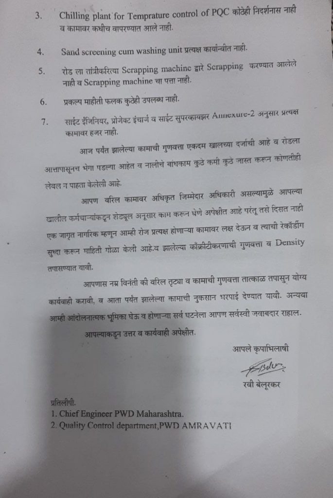 वणी शहरातील चिखलगाव रेल्वे गेट ते टिळक चौक ते वरोरा रेल्वे गेट पर्यंत सुरू असलेल्या सिमेंट कॉंक्रिट रस्त्याचे बांधकामात आतापर्यंत झालेल्या कामाची गुणवत्ता निकुष्ट दर्जाची असुन, या रस्त्याला आतापासूनच भेगा पडल्या आहे, नालीचे काँक्रीट बांधकाम कुठे कमी तर कुठे जास्त लेव्हल न पाळता आधे अधुरे काम करुन सोडुन दिले आहे. या कामामुळे नागरिक त्रस्त झाले आहे. या रस्त्याचे बांधकाम पांढरकवडा बांधकाम विभागाच्या कार्यकारी अभियंत्याच्या देखरेखी खाली सुरू आहे. असे असले तरी संबधीत ठेकेदाराकडून निविदेत असलेल्या अटी व शर्थिचे पालन केले जात नाही. कंत्राटदाराने निवेदेत दाखविलेल्या आर एम सी प्लांटची जागा व प्रत्यक्ष आर एम सी पुरवठ्याची जागा निश्चित नाही. प्लांट एम ६० कागदावरच असुन स्काडा रिपोर्टहि संशयास्पद असल्याचा आरोप रवि बेलुरकर यांनी तक्रारीतुन केला आहे.