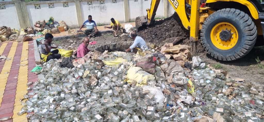 पोलीस स्टेशन वडकी येथे दिनांक १२/८/२०२३ रोजी विविध गुन्ह्यांमध्ये पकडण्यात आलेल्या देशी व विदेशी दारूच्या ८९ गुन्ह्यांमधील एकूण मुद्देमाल १२ ६७७ बॉटल ज्याची किंमत १२ लाख१४२ रुपये आहे त्या न्यायालयाकडून निकाल लागल्यामुळे व अधीक्षक राज्य उत्पादन शुल्क यवतमाळ यांच्या परवानगीने सदर दारूच्या देशी व विदेशी बाटल्या चा मुद्देमाल पोलीस स्टेशन मैदानात निरीक्षक राज्य उत्पादन शुल्क पांढरकवडा यांचे उपस्थितीत पंचा समक्ष जेसीबीने मोठा खड्डा करून त्या खड्ड्यात दारू खाली करून मुद्देमाल नष्ट करण्यात आला. या महिन्यांमध्ये एकूण ११८ गुन्ह्यातील मुद्देमाल नष्ट करण्यात आला आहे.