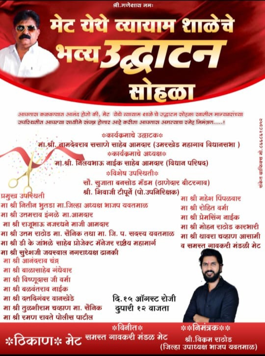 उमरखेड तालुक्यामधील ग्रामीण भाग म्हणून ओळखल्या जाणारे मेट गावातील सरपंच विक्रम भाऊ राठोड तथा जिल्हा उपाध्यक्ष भाजप यवतमाळ यांनी अतिशय मेहनत घेऊन लहानश्या मेट गावामध्ये व्यायाम शाळेंचे काम मंजूर करून व्यायाम शाळेंचे काम पूर्ण करून दाखविले आहे मेट गावामध्ये त्याची नागरिका कडून कौतुक होत आले त्यांनी हा व्यायाम शाळेंचे उदघाटन 15/ऑगस्ट निमित्त पार पडणार आहे या उद्धाटन सोहळ्यास खालील मान्यवर पदाधिकारी उपस्थित कार्यक्रमचे उदघाटन आमदार नामदेवरावजी ससाणे साहेब यांच्या शुभ हस्ते होणार आहे व या कार्यक्रमाचे अध्यक्ष म्हणून मा. श्री.निलयभाऊ नाईक साहेब आमदार व विशेष उपस्थिती सौ. सुजाता बनसोड मॅडम (ठाणेदार बिटरगाव )श्री. टिपूने शिवाजी (पोलीस उपनिरीक्षक )बिटरगाव प्रमुख उपस्थिती मा. नितीनजी भूतडा जिल्हा अध्यक्ष भाजप यवतमाळ मा. श्री. उत्तमराव इंगळे मा. आमदार,मा. श्री. राजूभाऊ नजरधने, मा. आमदार उत्तम राठोड मा. सैनिक तथा माजी जिल्हा परिषद यवतमाळ मा. श्री. डी. के जाभंळे साहेब प्रोजेकट मॅनेजर राष्टीय महामार्ग मा श्री. सुरेशजी जयस्वाल नगराध्यक्षा ढाणकी,मा. श्री आनंदराव चंद्रे,मा. श्री. बाळासाहेब गंधेवार,मा. श्री विष्णूदासजी वर्मा,मा. श्री बळवंतराव नाईक,मा. श्री. दत्त दिगांबर वानखेडे,मा. श्री. तुळशीराम चव्हाण मा. सैनिक, मा. श्री रमण रावते पोलीस पाटील, मा. श्री महेश पीपळवार, मा श्री. रोहित वर्मा, मेट गावातील वरिष्ठ पुढारी श्री.प्रेमसिंग नाईक,श्री.मोहन राठोड (कारभारी )श्री थावरा चव्हाण (असामी )यांच्या उपस्थितीत उद्या व्यायाम शाळेंचे. भव्य उद्धाटन सोहळा पार पडणार आहे