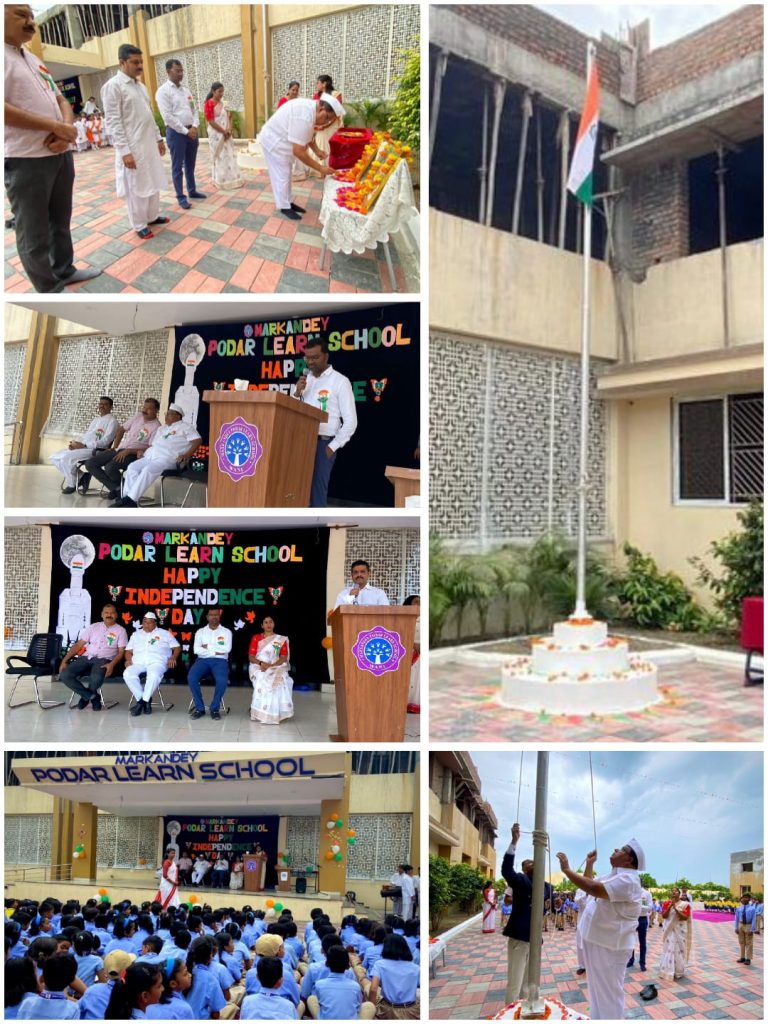 मार्कंडेय पोदार लर्न स्कूल वणी येथे 77 वा स्वातंत्र्यदिन साजरा करण्यात आला प्रसंगी प्रमुख पाहुणे म्हणून संस्था अध्यक्ष मान, रमेशजी सुंकुरवार, संस्था सचिव मान, राहुल सुंकुरवार, संचालक प्राची सुंकुरवार पालक वृंद शाळेचे मुख्याध्यापक मुख्याध्यापक मान,आमिननुरानी, उपस्थित होते, प्रसंगी फोटोला हार अर्पण दिप प्रज्वलन करुन मान, रमेशजी सुंकुरवार अध्यक्ष यांचे हस्ते ध्वजारोहन करण्यात आले.मुलांनी राष्ट्रगीत म्हंटले , प्रसंगी आनंदमय वातावरण होते. मुलांनी प्रमुख पाहुणे यांना पथसंचलन करुन मानवंदना देण्यात आली स्वातंत्र्य दिनाचा उत्साह त्याच बरोबर मुलांना देशप्रेम, समता बंधुभाव एकात्मता निर्माण करण्याच्या हेतूने सांस्कृतिक कार्यक्रमाचे आयोजन करण्यात आले प्रसंगी स्वागत गीत, देशभक्ती गीत सादर करण्यात आले, संस्था सचिव राहुल सुंकुरवार यांनी मुलांना थोर महापुरुष, तसेच स्वातंत्र्य करीता त्यांचे योगदान यावर सखोल माहिती दिली. मुख्याध्यापक मान आमिन नुरानी यांनी मुलांना स्वातंत्र्य दिनाचे महत्त्व सांगितले, त्यानंतर मुलांनी आपल्यातील सुप्त कला गुणाचे सादरीकरण केले यात भाषण,देशभक्ती गीत गायन, नृत्य सादर करण्यात आले. यात विद्यार्थ्यानी सहभाग नोंदविला, कार्यक्रमाचे संचालन उल्काताई काकडे तर आभार अनुश्री देशपांडे यांनी मानले कार्यक्रम यशस्वितेकरीता शिक्षक तथा शिक्षकेत्तर कर्मचारी आणि परिश्रम घेतले, समारोप प्रसंगी मुलांना खाऊ देण्यात आला.