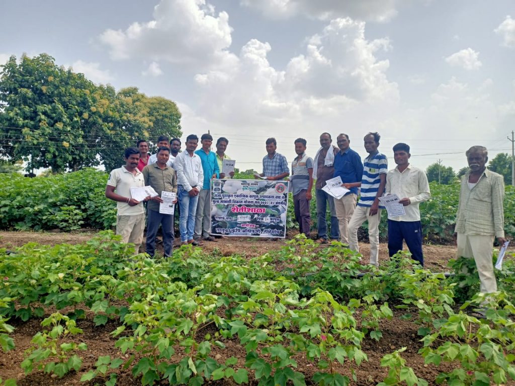 फवारणी करिता दुषित पाणी न वापरता स्वच्छ पाणी वापरावे कामगऺध पक्षी थाऺबे,पिवळे चिकट सापळे या बाबत माहीती देण्यात आली. बिव्हेरीया बासियाना, व्हर्ट्टीसेलियम लेकएनी, या सारख्या मित्र बुरशीचा वापर करणे अशा प्रकारे जैविक पद्धतीने नियंत्रण करण्याचे मार्गदर्शन केले कापसाची फरदड न घेता हंगाम संपल्या नंतर पऱ्हाट्या पासून कंपोस्ट खत तयार करण्याचे आव्हान केले पोकरा व महाडीबीटी योजने विषयी माहिती दिली तसेच लघु उद्योगांना बळकटी करणासाठी ३५% अनुदान असलेली PMFME योजनेत सहभागी होण्याचे व PM किसान योजनेतील लाभार्थ्यांना ekyc आधार सिडिंग पूर्ण करण्याचे आव्हान उपस्थितांना करण्यात आले. तसेच फवारणी करताना घ्यावयाची काळजी बाबत मार्गदर्शन केले . या वेळी सदर शेतिशाळेला मंडळ कृषी अधिकारी विजय धांडे , कृषी पर्यवेक्षक संतोष पवार माजी सरपंच रमेश मंगाम, शेतकरी विलास डंभारे, निखिल ठोंबरे, रमेश भोयर , सूरज भोयर, कुमार शेंडे ,अतुल पंडित, नंदुरकर, सोळांखे, असंख्य शेतकरी उपस्थीत होते. प्रकल्पातील १००हेक्टर क्षेत्रा करिता प्रकल्पातील १०० शेतकऱ्यांना नॅनो युरिया, नॅनो डीएपी, फेरोमन ट्रॅप,लूर, इमिडा क्लोप्राइड इत्यादी कृषी निविष्ठांचा वाटप करण्यात आला.