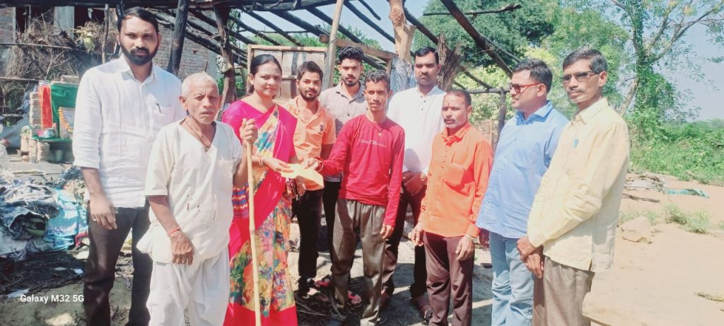 पोंभुर्णा तालुक्यातील देवाडा बुज येथील श्री घनश्याम घोटेकर यांचे घर जळून खाक झाले. यामध्ये त्यांचे घरातील सर्व सामान तसेच शेतीउपयोगी वस्तू जळून खाक झाले. याची माहिती मिळताच. मा.आमदार तथा पालकमंत्री चंद्रपूर सुधीरभाऊ मुनगंटीवार यांनी आर्थिक मदत केली. यावेळी स्थळाची पाहणी करून संबंधित अधिकऱ्याशी मा सुधीर भाऊ फोन वरून संपर्क करून शासकीय मदत देण्याचे निर्देश दिले.यावेळी अल्काताई आत्राम प्रदेश महामंत्री म.रा , तुळशीराम रोहणकर अध्यक्ष संजय गांधी निराधार समिती,अजय मस्के युवा मोर्चा अध्यक्ष, विनोद मारशेट्टीवार भाजपा थोवाजी घोटेकर भाजपा,नेरु मोरे युवा मोर्चा कार्यकर्ता , दिनेश घोडे, घनश्याम घोटेकर व त्यांच्या परिवारातील सदस्य, गावकरी उपस्थित होते.