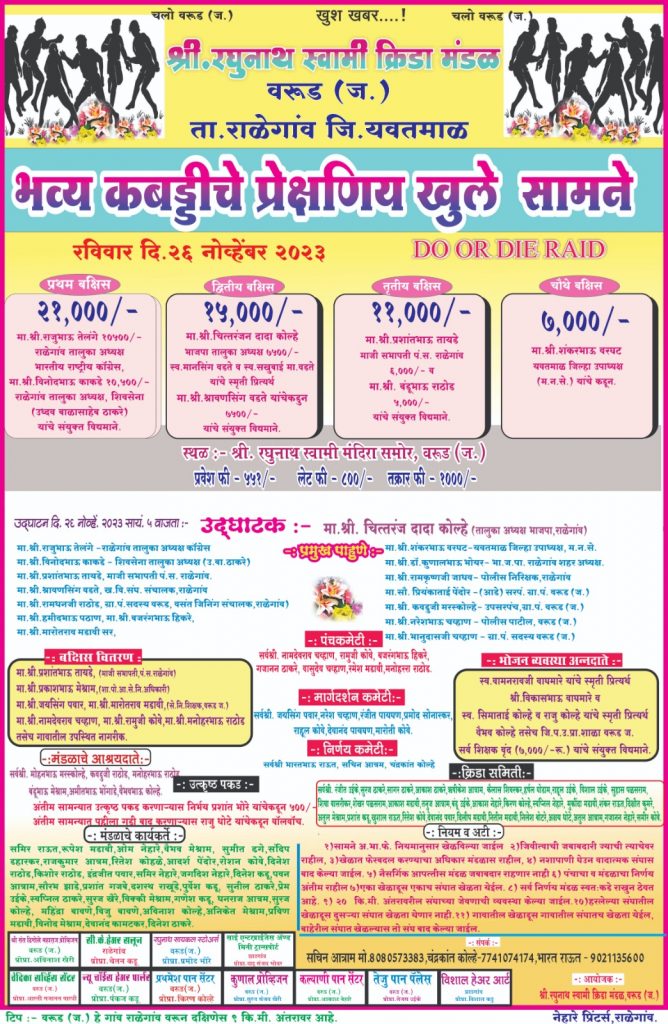 राळेगाव तालुक्यातील वरूड जहांगीर हे गाव एका वेळी कबड्डी या खेळासाठी प्रसिद्धीस आलेले गाव असून या गावात एक म्हण प्रचलित झाली होती कि , घर तेथे खेळाडू. आणि ती म्हण आज सुद्धा कायम असून या गावाला कबड्डी खेळाचे फार वेड असून दरवर्षी प्रमाणे या वर्षी सुद्धा गावातील कबड्डी प्रेमी तरूणांनी गावात कबड्डी या खेळाचे आयोजन केले असून प्रथम पारितोषिक 21000 रूपये रोख बक्षीस भारतीय राष्ट्रीय काँग्रेस पक्षाचे तालुकाध्यक्ष श्री राजेंद्र तेलंगे व उद्धव बाळासाहेब ठाकरे शिवसेनेचे तालुकाप्रमुख श्री विनोद काकडे यांच्या कडून, द्वितीय पारितोषिक15000रूपये रोख भारतीय जनता पक्षाचे तालुकाध्यक्ष श्री चित्तरंजन कोल्हे व खरेदी विक्री संघाचे संचालक श्रावनसिंग वडते सर यांच्या कडून, तृतीय पारितोषिक 11000 रूपये रोख माजी पंचायत समिती सभापती प्रशांत तायडे व बंडू राठोड यांच्या कडून तर चतुर्थ पारितोषिक 7000 रूपये रोख महाराष्ट्र नवनिर्माण सेनेचे यवतमाळ जिल्हा उपाध्यक्ष शंकरराव वरघट यांच्या कडून ठेवण्यात आले असून या खेळाचे उद्घघाटन माजी जिल्हा परिषद सदस्य चित्तरंजन कोल्हे यांच्या हस्ते करण्यात येणार असून या कार्यक्रमाला प्रमुख पाहुणे म्हणून उपस्थित भारतीय राष्ट्रीय काँग्रेस पक्षाचे तालुकाध्यक्ष राजेंद्र तेलंगे, उद्धव बाळासाहेब ठाकरे शिवसेनेचे तालुकाप्रमुख विनोद काकडे, माजी पंचायत समिती सभापती प्रशांत तायडे, खरेदी विक्री संघाचे संचालक श्रावनसिंग वडते सर, वसंत जिनिंग राळेगावचे संचालक रामधन राठोड, राळेगाव येथील सामाजिक कार्यकर्ते हमिदभाई पठाण, बजरंग हिकरे, सेवानिवृत्त शिक्षक तथा माजी कबड्डी खेळाडू मारोतराव मडावी , मनसे जिल्हा उपाध्यक्ष शंकरराव वरघट, डॉ.कुणाल भोयर, राळेगाव पोलिस निरीक्षक रामकृष्ण जाधव, वरूड सरपंच सौ प्रियंका पेंदोर, उपसरपंच कवडूजी मरस्कोल्हे, वरूड पोलिस पाटील नरेश चव्हाण, ग्रामपंचायत सदस्य भानुदास चव्हाण हे मान्यवर उपस्थित राहणार असून या खेळाचे रितसर उद्घाटन रविवारी दिंनाक 26/11/2023 रोजी होणार असून बक्षिस वितरण सुद्धा माजी पंचायत समिती सभापती प्रशांत तायडे, सेवानिवृत्त अधिकारी प्रकाश मेश्राम, जयसिंग पवार, मारोतराव मडावी, नामदेव चव्हाण,रामूजी कोवे, मनोहर राठोड यांच्या हस्ते वितरित करण्यात येणार असून या प्रसंगी खेळाडूची भोजनाची व्यवस्था सुद्धा करण्यात आली असून क्रिडा प्रेमी तरूणांनी या सुवर्ण संधीचा पुरेपूर लाभ घ्यावा असे मंडळाच्या वतीने सचिन आत्राम यांनी आवाहन केले आहे.