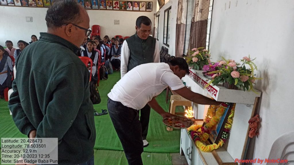 इंदिरा गांधी कला महाविद्यालय, राळेगाव येथे २० डिसेंबर रोजी राष्ट्रीय सेवा योजनेच्या वतीने वैराग्यमूर्ती संत गाडगे बाबा यांच्या ६७ व्या स्मृतिदिनानिमित्त विविध कार्यक्रमांचे आयोजन करण्यात आले. कार्यक्रमाच्या अध्यक्षस्थानी महाविद्यालयाचे प्राचार्य डॉ. एस. व्ही. आगरकर व प्रमुख पाहुणे म्हणून शि. प्र. म. विद्यान व गिलानी कला, वाणिज्य महाविद्यालय, घाटंजी, रसायन शास्त्राचे विभाग प्रमुख प्राध्यापक व्ही. एस. जगताप उपस्थित होते. कार्यक्रमाचे प्रास्ताविक राष्ट्रीय सेवा योजना कार्यक्रमाधिकारी प्रा. स्वप्नील गोरे यांनी केले. कार्यक्रमाला प्रमुख वक्ते म्हणून लाभलेले प्रा. डॉ. व्ही. एस. जगताप यांनी आपल्या भाषणातून संत गाडगेबाबांचे चरित्र व कार्य विशद केले तर प्राचार्य डॉ. एस. व्ही. आगरकर यांनी आपल्या अध्यक्षीय भाषणातून गाडगे बाबा यांनी दिलेल्या दशसूत्रीचे आजच्या घडीला असलेले महत्त्व पटवून विद्यार्थ्यांचे उद्बोधन केले. अभिवादन सभेनंतर राष्ट्रीय सेवा योजनेच्या सर्व स्वयंसेवक विद्यार्थ्यांनी व शिक्षक-शिक्षकेतर कर्मचाऱ्यांनी महाविद्यालय परिसरात स्वच्छता अभियान राबवून संपूर्ण परिसर लख्ख करून स्वच्छतेच्या माध्यमातून अभिवादन केले. या स्वच्छता अभियानामध्ये रासेयो महिला कार्यक्रमाधिकारी प्रा. भाग्यश्री कृ. लोहकर, सहकार्यक्रमाधिकारी प्रा. अमोल लिहितकर यांचेसह शिक्षकेतर कर्मचारी व बहुसंख्य राष्ट्रीय सेवा योजनेचे स्वयंसेवक विद्यार्थी सहभागी झाले. कार्यक्रमाचे सूत्रसंचालन कु. कीर्ती राऊत हिने तर आभार प्रदर्शन कु. मानसी भोयर हिने केले.