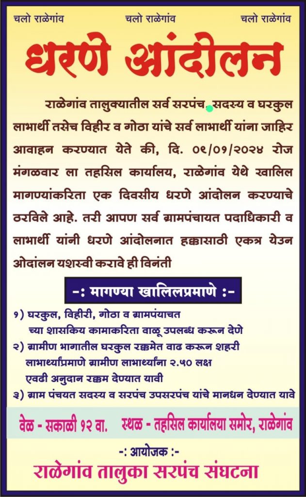 राळेगाव तालुक्यातील तालुका सरपंच संघटनेच्या वतीने दिनांक ९ जानेवारी २०२४ रोज मंगळवार ला विविध मागण्या संदर्भात तहसील कार्यालय समोर एक दिवसीय धरणे आंदोलन करण्यात येणार आहे.