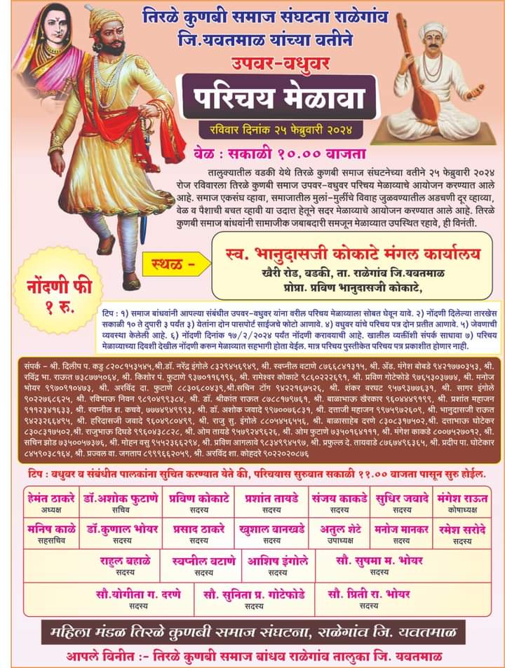 राळेगाव तालुक्यातील वडकी येथे दि.25 फेब्रु.2024 ला तिरळे कुणबी समाज उपवर -वधूवर परिचय मेळाव्याचे आयोजन करण्यात आले आहे. स्व. भानुदासजी कोकाटे मंगल कार्यालय येथे स.10 वा पासून या परिचय मेळाव्यास सुरुवात होईल.समाज बांधवानी सामाजिक जबाबदारी समजून मोठ्या संख्येने यात सहभागी व्हावे असे आवाहन राळेगाव तालुका तिरळे कुणबी समाज संघटनेच्या वतीने करण्यात आले आहे.