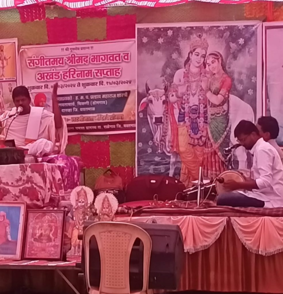 राळेगाव पासून जवळच असलेल्या गुजरी नागठाणा येथील लक्ष्मी माता मंदिरात संगीतमय श्रीमद् भागवत कथा व ज्ञानयज्ञाची सांगता ,दिनांक 15/ 3 /2024 शुक्रवार ला संपन्न झाली. श्रीमद् भागवत कथा चे वाचन 07 ते 15 मार्चपर्यंत ह भ प प्रल्हाद महाराज शास्त्री भागवतचार्य चिकणी डोमगाव, तालुका दारव्हा यांच्या अमृतवाणीतून सकाळी 09ते 11 व दुपारी 03 ते 05 या कालावधीत करण्यात आली. श्रीमद् भागवत कथेनिमित्त ग्रामसफाई सामुदायिक ध्यान, काकडा ,रामधून ,ग्रामगीता वाचन खंजिरी भजन, कीर्तन ,सर्व रोगनिदान शिबिर, कलश यात्रा दीप यज्ञ, गायत्री महायज्ञ ,डायका गोंधळ ,सामुदायिक प्रार्थना, गुजरी नागठाणा येथील अपंग व्यक्तींचा, सेवानवृत्त व्यक्तींचा शासकीय सेवेत सेवा करीत असणारे ,तसेच आत्महत्याग्रस्त कुटुंबातील कुटुंब प्रमुखांचे सांत्वन 2023 मध्ये लग्न झालेल्या मुला मुलींचा ,तालुक्यातील पत्रकारांचा भागवत सप्ताहात बाहेरगावातील सहभागी व्यक्तींचा मान्यवरांचा सन्मान .रांगोळी स्पर्धा श्रीकृष्ण जन्मोत्सव, गोवर्धन पूजा, हरिपाठ, भारुड,, गावातील मुलींचे सांस्कृतिक कार्यक्रम इत्यादी विविध विषयांवर प्रवचन प्रबोधन राधे राधे च्या गजरात मंदिर परिसरात मंदिर परिसर भक्तीमय झाला होता या सप्ताहात दैनंदिन हरिकीर्तनाच्या कार्यक्रमात हभप पंढरीनाथ ठाकरे वेणी जागोना ह भ प चंद्रकांत महाराज कापशीकर कापसी ,ह भ प नामदेव महाराज वाडही निधोरा ,हभप गोपाल महाराज बोरसरे वडकी, ह भ प अरुण भाऊ सालोडकर आडगाव खाकी ,ह भ प अरुण खंगार खैरी, ह भ प गजानन महाराज सुरकर सावंगी ,नामवंत कीर्तनकाराची कीर्तन झाली. या सप्ताहात सप्त खंजिरी वादक पंढरीनाथ ठाकरे जागोना यांची कीर्तन व शेडी माड येथील श्री ठाकरे व संच मंडळ यांचा हरिपाठ झाला .सप्ताहाचे शेवटी गावाच्या मुख्य मार्गावर टाळ मृदंगाच्या गजरात भव्य पालखी काढण्यात आली. पालखीमध्ये नागरिकांनी मोठ्या संख्येने उपस्थित राहून हरिनामाचे भजन करून टाळ हाती घेतले. होते गावातील महिलांनी रस्त्यावर रांगोळी काढून पालखीची शोभा वाढविली होती तर अकरा वाजता काल्याचे किर्तन भागवताचार्य प्रल्हाद महाराज शास्त्री यांच्या वाणीतून होऊन त्यांच्या हस्ते दहीहंडी फोडण्यात आली. या समारोपिय कार्यक्रमाला समस्त ग गुजरी नागठाणा गावातील नागरिक ,मान्यवर प्रमुख पाहुणे तसेच सर्व आमंत्रित भजन मंडळ हे उपस्थित होते .गुजरी नागठाना गावात अवैध दारू विक्री व हातभट्टी दारू काढणे या बाबत बंदी झाल्याचे ग्रामस्थांनी जाहीर केले .नंतर महाप्रसादाची वितरण करण्यात आले .या महाप्रसादाचा हजारो भाविकांनी लाभ घेतला सप्ताहाला जिल्ह्यातील तालुक्यातील ज्येष्ठ श्रेष्ठ मान्यवर गुरुदेव सेवा मंडळाचे कार्यकर्ते सामाजिक कार्यकर्ते सहभागी 
