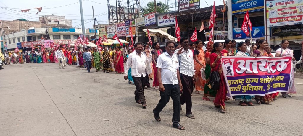 आयटक महाराष्ट्र राज्य शालेय पोषण आहार कर्मचारी युनियनच्या वतीने १२ जुन राज्यव्यापी आंदोलनाची हाक दिल्या नुसार प्रलंबित मागण्यांकडे शासनाचे लक्ष वेधण्यासाठी राज्यभर जिल्हा परिषद वर आंदोलन करण्याचे आवाहन केले होते त्यानुसार श्रमशक्ती भवन यवतमाळ येथुन आयटक महाराष्ट्र राज्य शालेय पोषण आहार कर्मचारी युनियनच्या वतीने मोर्चा काढण्यात आला मोर्चा घोषणा देत सरळ जि.प.मार्गे संविधान चौक मार्गे नेताजी मार्केट, दत्त चौक मार्गे जुना बसस्टँड मार्गक्रमण करत जिल्हापरीषदेवर मोर्चा धडकला त्यात शालेय पोषण आहार कर्मचारी यांना २६०००/- मानधन / वेतन द्या व जि.प.शिक्षण विभागात कायम करा या मुख्य मागणी, सह ईतरही मागण्याचे निवेदन मा. मुख्य कार्यकारी अधिकारी जिल्हापरिषद यवतमाळ यांचे मार्फत मा.पंतप्रधान ,भारत सरकार, मा.केद्रीय शीक्षण मंत्री , मंत्रालय नई दिल्ली तसेच मा.ना.एखनाथजी शिंदे,मुख्यमंत्री महाराष्ट्र राज्य मुंबई,यांना व मा.शीक्षण मंत्री महाराष्ट्र राज्य यांना पाठविण्यात आले दिनांक 12/06/2024 रोजीच्या मोर्चात प्रधानमंत्री पोषणशक्ती निर्माण योजने अंतर्गत शाळेत पोषण आहार तयार करून मुलांनाजेवण देणाऱ्या सदर कर्मचाऱ्यांना केंद्रसरकार 60 टक्के व राज्य सरकार 40 टक्के मानधन कोटा देण्याचे धोरण ठरले असतांना सध्या केंद्र शासन दरमहा रू. 600/- व राज्य शासन दरमहा रू. 1900/- असे एकत्रीत दरमहा रु. 2500/- मानधन /वेतन देत आहे. केंद्रसरकारने राज्य सरकार प्रमाणे मानधनात वाढ केली नाही त्यांना 1 एप्रिल 2023 पासून महीन्याकाठी फक्त रू. 2500/- मानधन मिळतात. एवढ्या तुटपुंज्या मानधनावर कर्मचाऱ्यांनी आपला उदरनिर्वाह कसा चालवायचा ? हा आमच्या समोर खरा यक्ष प्रश्न आहे.दुसरीकडे मात्र आमदार यांचे दरमहा मानधन दोन लाखाचे जवळपास आणि खासदार यांचे दरमहा मानधन तीन लाखांचा जवळपास व इतर बाकी भत्ते, पेन्शन लागू आहे. मग आमदार, खासदार, मंत्री यांना जगण्याकरीता एवढे मानधन लागतात तर योजना कर्मचारी रू. 2500/- मध्ये ह्या जिवघेण्या महागाईत कसे जगत असतील ? याचाही विचार केंद्र व राज्य सरकारनी करावा. शालेय पोषण आहार कर्मचारी यांच्या मानधनात भरीव वाढ करावी अशी आम्ही मागणी करीत आहेत मागण्या शालेय पोषण आहार कर्मचारी यांना दरमहा किमान वेतन एकत्रीत रू. 26,000/- मानधन/वतन द्या.,मा. शिक्षणमंत्री यांनी दिनांक 18/12/2023 रोजी नागपूर हिवाळी अधिवेशनात शालेय पोषण आहार कर्मचारी, स्वयंपाकी व मदतनीस यांना दरमहा रू. 1500/- मानधन वाढ देण्याचे कबूल केले. त्याचा शासन निर्णय (जी. आर.) त्वरीत काढण्यात यावा.,मानधन दर महिन्याच्या १ तारखेला द्या व सामाजिक सुरक्षा लागु करा.,त्यांना कामानिमित्त रजा मंजूरकरा व बदल्यात दुसऱ्या कर्मचाऱ्यांची मागणी करू नका., ग्रामीण भागातील कर