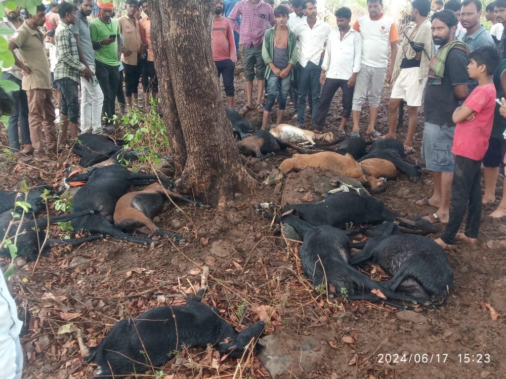सर्वत्र बकरी ईद उत्साहात साजरी होत असताना चुरमुरा येथे अचानक आलेल्या वादळ वारा व विजेच्या कडकडाटासह पावसात झाडावर वीज कोसळून झाडाखाली असलेल्या १७ बकऱ्या व ४ बोकड मृत झाल्याची घटना तालुक्यातील चुरमुरा येथे दुपारी तीन वाजता चे दरम्यान घडली सुदैवाने यात मनुष्यहानी झाली नाही. बकरी चरणाऱ्या कळपात एकूण 80 बकरी व बोकड होते त्यातील झाडाखाली आश्रय घेणाऱ्या बकऱ्या दगावल्या व इतर 59 बकऱ्यांचे प्राण वाचले.
