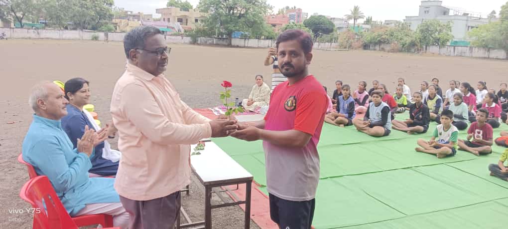 हिंगणघाट. जिल्हा क्रीडा अधिकारी कार्यालय वर्धा, तालुका क्रीडा संकुल प्रशिक्षण केंद्र व संजय गांधी स्मृती विद्या मंदिर हिंगणघाट यांच्या संयुक्त विद्यमाने दिनांक 21 जून 2024 शुक्रवारला आंतरराष्ट्रीय योगा दिन मोठ्या उत्साहामध्ये साजरा करण्यात आला. आंतरराष्ट्रीय योगा दिनाचा कार्यक्रम जिल्हा क्रीडा अधिकारी माननीय आशा मेश्राम मॅडम, क्रीडा अधिकारी माननीय अनिल निमगडे, संदीप खोब्रागडे, राज्य क्रीडा मार्गदर्शक भोजराज चौधरी यांच्या मार्गदर्शनाखाली घेण्यात आला.या आंतरराष्ट्रीय योगा दिनाला प्रमुख पाहुणे माननीय योग गुरु अजय जी वानखेडे, माननीय वैशाली वणीकर, संजय मेमोरियल टीचर्स एज्युकेशन सोसायटी हिंगणघाट सचिव महोदय, माननीय राजीव महाजन मुख्याध्यापक संजय गांधी स्मृती विद्या मंदिर , हिंगणघाट तालुका क्रीडा संयोजक बी. एल. खांडरे, क्रीडा मार्गदर्शक मुस्तफा बक्स, अजय बारसागडे, किड्स ब्राईट फ्युचर क्लब चे सर्व खेळाडू, वॉरियर्स क्लब चे सर्व खेळाडू, बीसीसी बॉक्सिंग क्लब चे खेळाडू तसेच किक बॉक्सिंग , बॉक्सिंग चे सर्व खेळाडू संजय गांधी स्मृती विद्या मंदिर हिंगणघाट या शाळेचे सर्व शिक्षक शिक्षकेतर कर्मचारी या आंतरराष्ट्रीय योग दिनाच्या कार्यक्रमांमध्ये सहभागी झाले होते. या कार्यक्रमाचे सूत्रसंचालन व आभार तालुका क्रीडा संयोजक बी. एल. खांडरे यांनी केले हा कार्यक्रम यशस्वी करण्याकरिता क्रीडा मार्गदर्शक मुस्तफा बक्स, अजय बारसागडे, किड्स ब्राईट फ्युचर क्लब चे सर्व खेळाडू, वॉरियर्स क्लब चे खेळाडू, बीसीसी ग्राउंडचे सर्व खेळाडू यांनी सहकार्य केले.