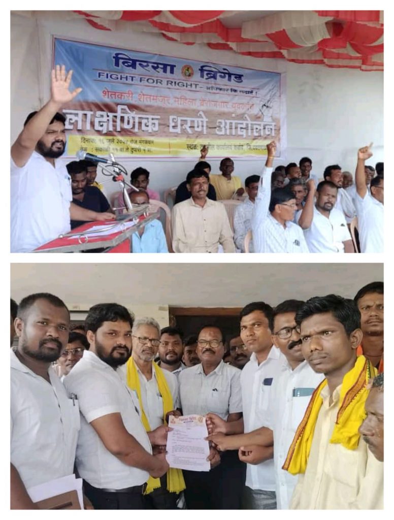 दिनांक १६ जुलै रोजी शेतकरी शेतमजूर , महिला व बेरोजगार युवकांच्या हक्क अधिकारासाठी बिरसा ब्रिगेड च्या वतीने कळम तहसीलवर डॉ. अरविंद कुळमेथे यांच्या नेतृत्वात लाक्षणिक धरणे आंदोलन करण्यात आले. डॉ.कुळमेथे यांनी समस्यांचा पाळा वाचला व आपल्या भाषणात शासनाने तात्काळ मागण्या पूर्ण कराव्यात अन्यथा आणखी तीव्र आंदोलन करू अशा पद्धतीचा इशारा दिला.या आंदोलनात प्रामुख्याने शेतकऱ्याच्या,शेतमजूर,बेरोजगारयुवक,महिला यांचे प्रश्ना संधर्भात जिल्हाधिकारी,मुख्यमंत्री यांना कळंब तहसील चे तहसीलदार यांच्या मार्फत निवेदन देण्यात आले.यावेळी मागील वर्षापासून शेतकऱ्यांना पिक विमा मिळाला नाही तरी तो तात्काळ देण्यात याव,शेतकऱ्यांची कर्ज माफी पूर्णतः करावी.शेतकऱ्यांना बँकेचे कर्ज,क्रॉप लोन तात्काळ देण्यात यावे,पाऊसा मुळे शेतकऱ्यांच्या बियाणाचे झालेले नुकसान झाल्यामुळे त्यांच्या शेताचे सर्वे करून शासनाने शेतकऱ्यांना नुकसन भरपाई देण्यात यावी,