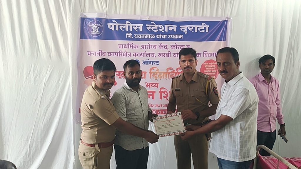 सरकार आणि अनेक सामाजिक संघटना रक्तदानाच्या जनजागृतीसाठी पुढाकार घेत आहेत. दरवर्षी ११० दशलक्ष युनिट रक्ताची गरज असते, परंतु त्यातील फक्त ७५% गरज भागवली जाते. या पार्श्वभूमीवर, अधिकाधिक लोकांनी रक्तदान करण्यासाठी पुढे येणे आवश्यक आहे.असे प्रतिपादन दराटी पोलीस स्टेशनचे कर्तृत्व आणि अभ्यासू बुद्धिमान सोज्वळ समाजसेवक अशी ओळख असलेले ठाणेदार योगेश वाघमारे यांनी स्वातंत्र्य दिनाचे औचित्य साधून दराटी पोलीस स्टेशन अंतर्गत रक्तदान शिबिरांचे कोर्टा प्राथमिक आरोग्य केंद्राचे डॉ संदीप दुबे वनविभागाचे वरिष्ठ वन अधिकारी यांच्या संयुक्त विद्यमाने आज दराटी पोलीस स्टेशन येथे रक्तदान शिबिर पार पडला यावेळी पोलीस स्टेशन अंतर्गत येणाऱ्या प्रत्येक गावातील नागरिकांनी उत्स्फूर्तपणे प्रतिसाद दिला या शिबिरामध्ये दराटी पोलीस स्टेशन येथील सर्व कर्मचारी सरपंच सरपंच पोलीस पाटील व काही होतकरू तरुणांनी रक्तदान करून खऱ्या अर्थाने स्वातंत्र्य दिन साजरा केला