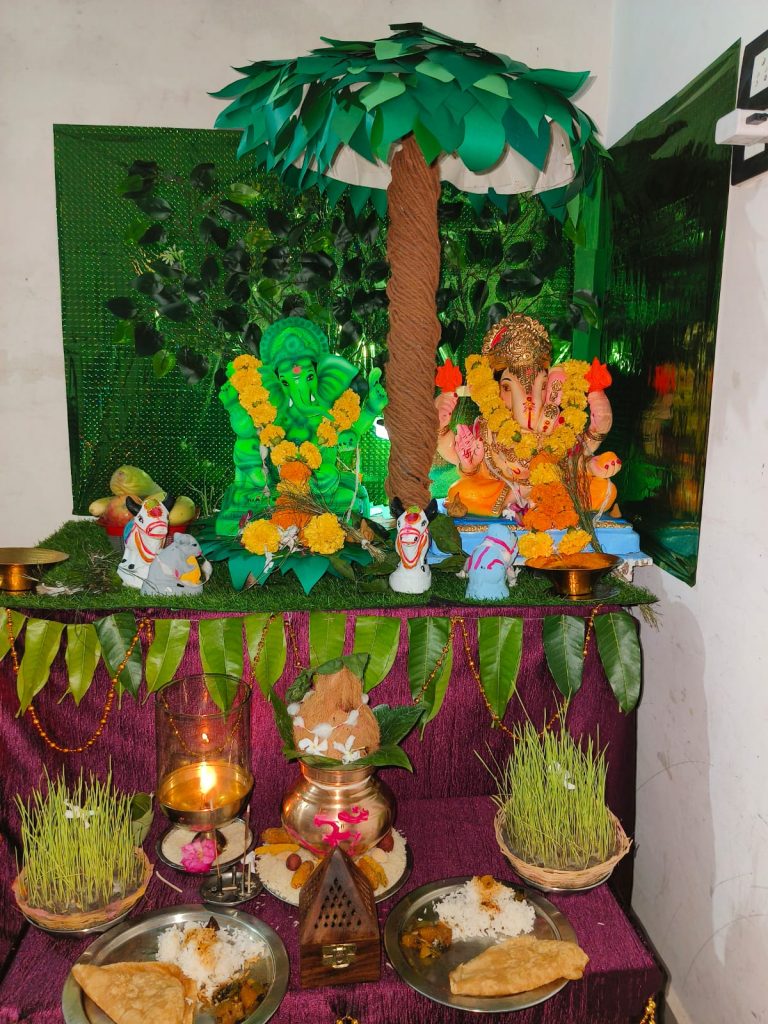 राळेगाव प स अंतर्गत येत असलेल्या स्थानिक सर्वोदय विद्यालय रिधोरा शाळेचे हरितसेना प्रभारी विज्ञान शिक्षक व त्यांच्या सुनबाई सौ गायत्री गजानन ढोके यांनी एकत्र गणपती बाप्पा स्थापना केली. त्यात सर्व सजावट हि प्लास्टिक मुक्त असून फक्त कागदांचा व पर्यावरनपुरक रंगांचा वापर केला आहे. विशेष म्हणजे सर्व सृष्टी हिरवीगार वनराई ने शोभावी यासाठी बाप्पाची प्रतिष्ठापना झाडाखाली करण्यात आली. विशेष म्हणजे मूर्ती हिरव्या रंगाची व अस्सल शाडूच्या मातीची तयार करुन घेण्यात आली. यंदा बैल पोळ्यातील बैलांची घटती संख्या विचारात घेता गाई बैल वाचवा हा संदेश देण्यासाठी बाप्पासोबत बैलजोडी ठेवण्यात आली. तंत्रज्ञानाच्या युगात आपण वावरत असलो तरी शेतीसाठी पाळीव प्राणी आवश्यक आहे असे दाखविण्यात आले. सदर सजावटीत सौ गायत्री गजानन ढोके व साक्षी बबन लोडे यांचे विशेष सहकार्य लाभले. सदर कल्पनेचे दोन्ही परिवारातील नातेवाईकांकडून व परिसरातील नागरिकांकडून कौतुक केल्या जात आहे.