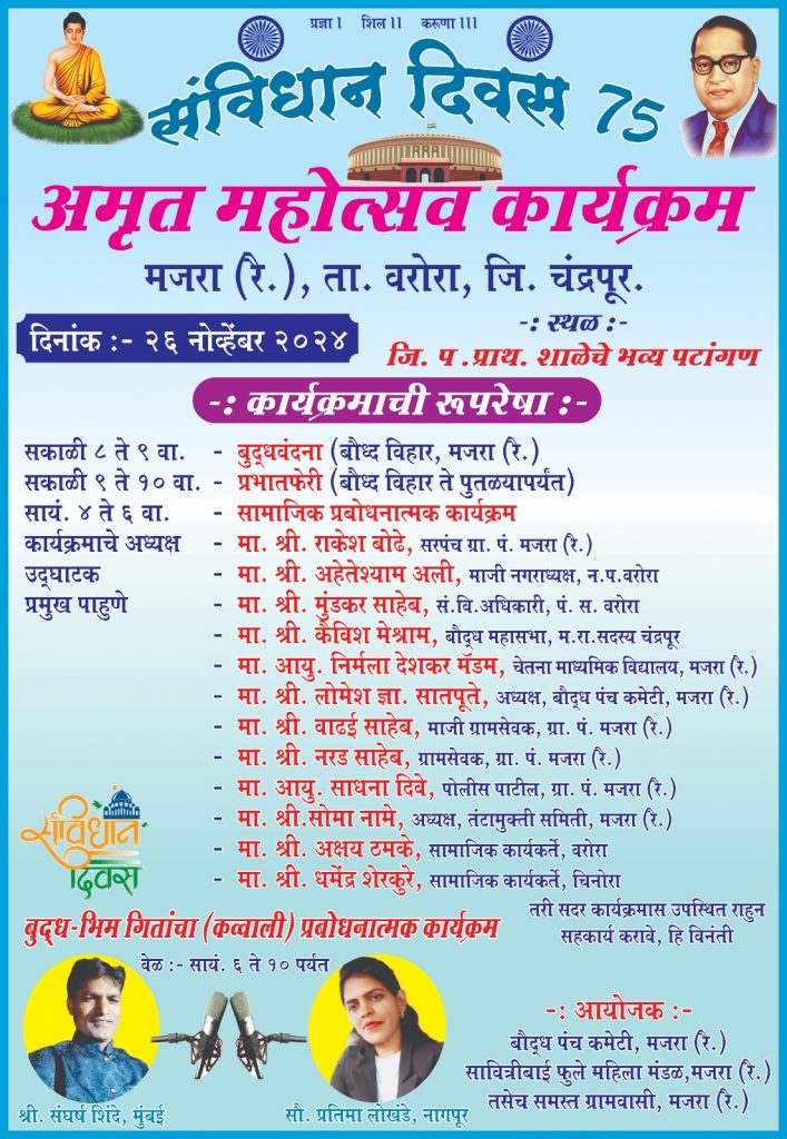 75 व्या संविधान दिनानिमित्त मजरा रै येथे आज संविधान जागृती व समाज प्रबोधनाचा कार्यक्रम आज 26 नोव्हेंबर रोजी आयोजित करण्यात आला आहे कार्यक्रमाचे अध्यक्ष म्हणून मजरा रै चे सरपंच राकेश बोढे तसेच उद्घाटक म्हणून वरोरा चे माजी नगराध्यक्ष अहेतेशाम अली प्रमुख पाहुणे म्हणून पंचायत समिती वरोराचे संवर्ग विकास अधिकारी बिडीओ गजानन मुंडकर ,कविश मेश्राम सदस्य बौद्ध महासभा महाराष्ट्र राज्य,सौ निर्मला देशकर शिक्षिका,लोमेश सातपुते अध्यक्ष बौद्ध पंच कमिटी मजरा रै , ग्रामसेवक सुरेश वाढई ,श्री नरड ग्रामसेवक ग्रामपंचायत मजरा ,आयु साधना दिवे पोलीस पाटील मजरा रै ,सोमाजी नामे अध्यक्ष तंटामुक्त समिती मजरा रै, अक्षय ठमके सामाजिक कार्यकर्ते वरोरा, धर्मेंद्र शेरकुरे सामाजिक कार्यकर्ते चिनोरा हे उपस्थित राहणार आहे,सकाळी ८ ते ९ बुद्ध वंदना बौद्ध विहार येथे, सकाळी ९ ते १० प्रभातफेरी , सायंकाळी ४ वाजता ते ६ वाजेपर्यंत संविधान जागृती व समाज प्रबोधनाचा कार्यक्रम जिल्हा परिषद शाळेच्या प्रांगणात आयोजित करण्यात आला आहे तसेच सायं ६ ते राञो १० वाजेपर्यंत मुंबई येथील संघर्ष शिंदे व प्रतिमा लोखंडे नागपूर यांचा बुद्ध व भीम गीतांचा कव्वालीचा प्रबोधनात्मक कार्यक्रम आयोजित करण्यात आला आहे जास्तीत जास्त लोकांनी कार्यक्रमाला उपस्थित राहण्याचे आवाहन बौद्ध पंच कमेटीचे अध्यक्ष लोमेश सातपुते यांनी केले आहे.