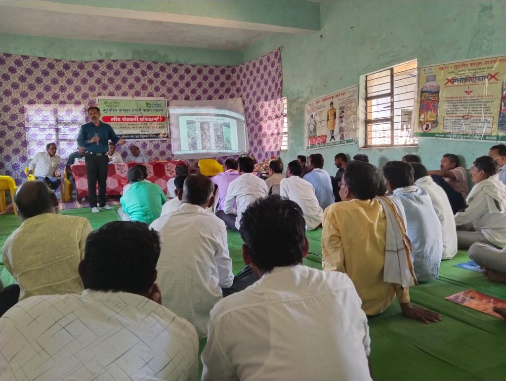 या प्रशिक्षण कार्यक्रमाचे प्रास्तविक श्री. नंदकिशोर डेहनकर यांनी केले, त्यांनी सुधारित कापूस आदर्श पद्धत प्रकल्प राबवत असलेले तत्व ज्यामध्ये डेटा व्यवस्थापन, नैसर्गिक संसाधने, पिक संरक्षण, कापूस गुणवत्ता , सभ्य काम आणि याबरोबरच वातावरण बदल व स्त्री-पुरुष सामानात यावर माहिती दिली . यासोबतच वातावरण बद्दलचे शेती उत्पादनावर होणारे परिणाम याबाबत सांगितले. कपाशी उत्पादन करतांना वाढणारा खर्च व नैसर्गिक साधनांचा वापर करून जैविक कीटनाशकाचा वापर करावा याबाबत माहिती दिली. कार्यक्रमाला प्रमुख मार्गदर्शक श्री. सचिन मातले यांनी जमिनीचे शाश्वत आरोग्य व्यवस्थापन यावर सादरीकरण करून उपस्थित शेतकरी बांधवाना मृदा आरोग्य याबाबत सांगलीतले. सुपीक जमिनीचे गुणधर्म, भौतिक,रासायनिक व जैविक घटकाचे महत्त्व समजावून सांगितले. जमिनीची रचना व सेंद्रिय पदार्थ जमिनीत टाकणे, पिकांचे अवशेष पासून खत बनविणे, हिरवळेचे पिके व विविध बांधावरील जैविक निविष्ठा याबाबत सखोल मार्गदर्शन केले. प्रगतशील LG लीडर श्री.अंबादासजी सोनवणे सराटी, यांनी जैविक कीटनाशक यामध्ये निंबोळी अर्क, दशपर्णी अर्क यावर सखोल मार्गदर्शन केले.