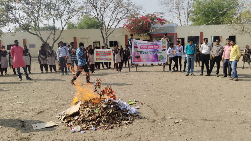 दिनांक 14/03/2025 रोजी गाडगे महाराज विद्यालय व कनिष्ठ महाविद्यालय अंतरगाव येथे इकोफ्रेंडली होळी साजरी करण्यात आली. हा उपक्रम सामाजिक वनीकरण विभाग व राष्ट्रीय हरित सेना युनिट कडून राबविण्यात आला, त्यासाठी राष्ट्रीय हरित सेनेचे कार्यक्रम अधिकारी संदीप सुरपाम व वनीकरण विभागाचे नस्करी सर व सरनाईक सर यांनी या मागची भुमिका विषद केली, पर्यावरणाला हानि न पोहचविण्याची शपथ सर्व विद्यार्थ्यांना देण्यात आली, पर्यावरण पूरक होळी पेटविण्याचा जबाबदारी अजय नरडवार सर यांनी पार पाडली,सर्व विद्यार्थ्यांना मटर पुलाव व जलेबी देऊन पळसाच्या फुलांपासून बनविलेले नैसर्गिक रंग उधळुन कार्यक्रमाची सांगता झाली..