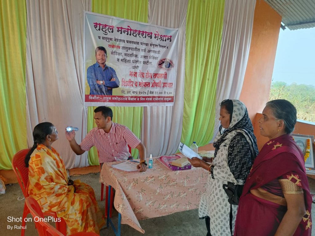 राहुल मेश्राम यांच्या पुढाकारातून राळेगाव तालुक्यात पहील्यांदाच महिलांसाठी मोफत नेत्ररोग तपासणी शिबिराचे आयोजन केले गेले होते. या शिबिराला महिलांचा उत्स्फूर्त प्रतिसाद मिळाला. सदर शिबिराची सुरुवात ही राजमाता जिजाऊ, आणि सावित्री बाई फुले यांच्या प्रतिमेचे पूजन आणि माल्याअर्पण करून करण्यात आले. त्यानंतर सदर शिबिराचे उद्घाटन हे वडकी येथील स्मॉल वंडर ज्युनियर कॉलेज च्या प्राचार्य डॉ. मंजुषा सागर मॅडम यांच्या हस्ते करण्यात आले. प्रमुख पाहुणे म्हणून आठमुरडी येथील प्रतिष्ठित नागरिक श्री. मारोती मेश्राम काका, व डॉ. हर्षल येरकाडे साहेब उपस्थित होते. सदर शिबिराचे उद्घाटन झाल्यानंतर नेत्ररोग तपासणी शिबिराला सुरुवात झाली. या मध्ये अंगणवाडी सेविका , मदतनीस, आशा सेविका, महिला पोलिस पाटील व परिसरातील इतर गावातील महिलांनी सहभाग नोंदवून आपल्या डोळ्यांची तपासणी करून घेतली. ही तपासणी डॉ.हर्षल येरकाडे. MBBS, MS (नेत्ररोग तज्ञ) यांनी केली. या शिबिरामध्ये काही रुग्णांना मोतीबिंदू हा आजार आढळला आहे. अश्या रुग्णांना एक दिवस ठरवून , नेत्ररोग तज्ञ यांच्या कडून मोफत मोतीबिंदू शस्त्रक्रिया करण्यात येणार आहे. परिसरातील