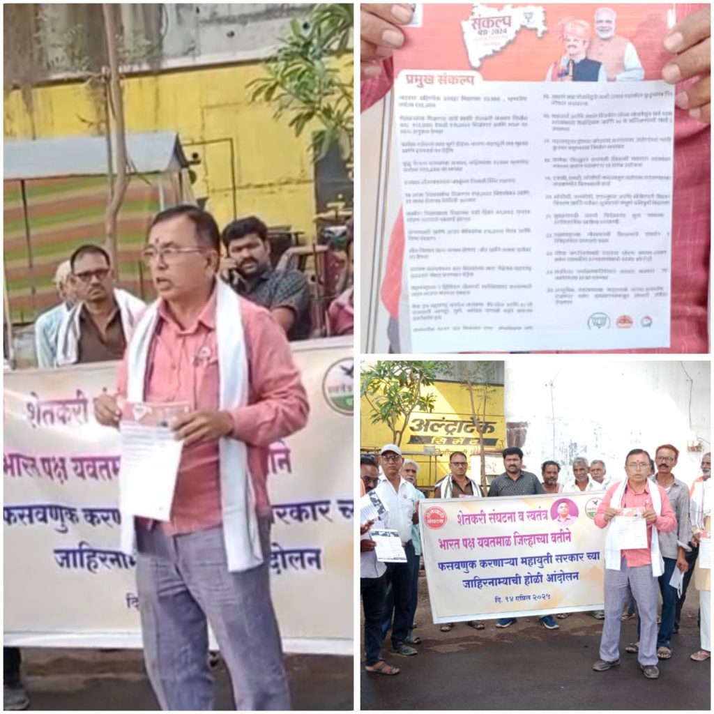 महायुती पक्षाने 2024 च्या विधानसभा निवडणुकीत त मतदाजोबा मागताना मताचा जोगवा मागताना शेतकऱ्याची संपूर्ण कर्जमुक्ती सातबारा कोरा, सोयाबीनला 6000 रुपये भाव, लाडक्या बहिणीला 2100 रुपये, शेती कर माफ, इत्यादी आश्वासने निवडणूक जाहीरनाम्यात व जाहीर सभांमधून दिले होते. परंतु पण तू 10 मार्च 2025 ला अर्थसंकल्पामध्ये कोणत्याही प्रकारची तरतूद करण्यात आलेली नाही उलट शेतकऱ्यांनी कर्ज भरावे असे जाहीर करून कर्ज वसुली सक्तीच्या नोटीचा पाठविल्या याचा निषेध म्हणून आज भारतीय घटनेचे शिल्पकार बाबासाहेब आंबेडकर यांच्या जयंती दिनाचे औचित्य साधून माहिती सरकारच्या फसव्या जाहीरनामाची शेतकरी संघटना व स्वतंत्र भारत पक्षाच्या वतीने होळी करण्यात आली यावेळी यावेळी जिल्हाध्यक्ष राजेंद्र झोटीग, युवा अध्यक्ष अक्षय महाजन ज्येष्ठ नेते सुरेशराव आगलावे, तालुका अध्यक्ष गिरीश तुर्के , गोपाल भोयर, गजानन कोल्हे, प्रदीप भोयर, गजानन पारखी, गजानन ठाकरे, श्रीहरी राजुरकर, सौरभ महाजन, भास्कर पाटील, सुरेश झोटीग, नामदेव राजूरकर, हनुमान चिडे, अशोक वाभीटकर, मारोतराव कावडे, प्रकाश चिडे, रवींद्र खिरटकर, बबनराव ठाकरे, विठ्ठल येडगुरे, प्रभाकर भोयर इत्यादी शेतकरी उपस्थित होते…