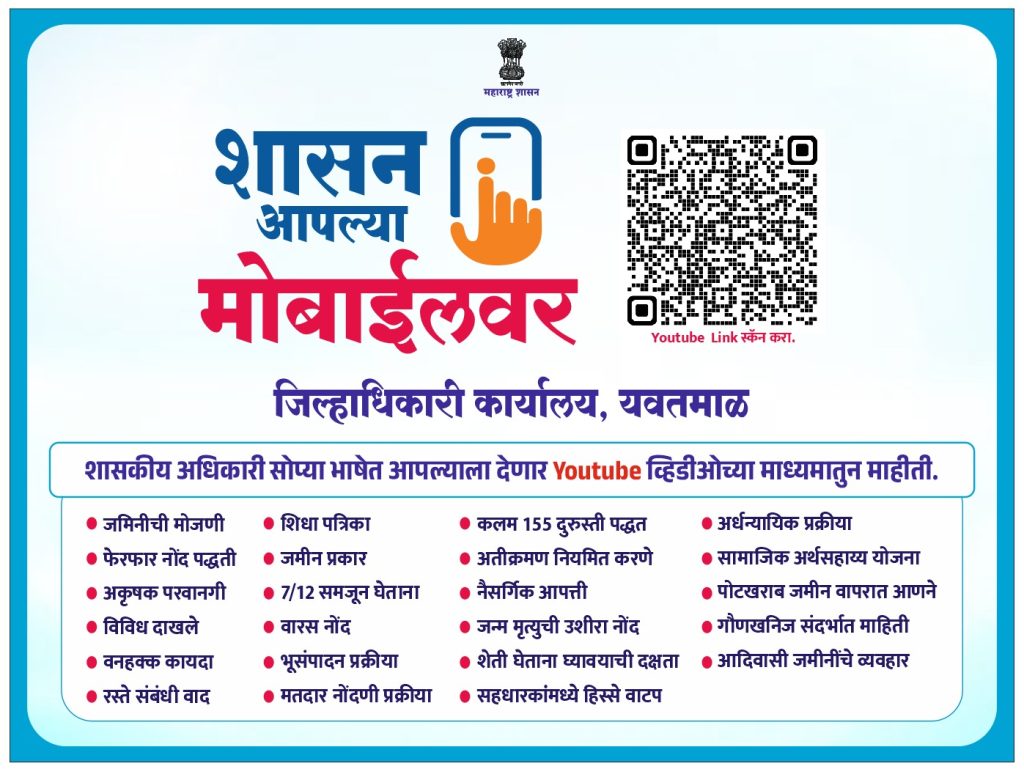 जिल्हाधिकारी कार्यालय यवतमाळ मार्फत राबवल्या जाणाऱ्या “शासन आपल्या मोबाईलवर” या उपक्रमाअंतर्गत लोकांना माहिती देण्यासाठी विविध कायदे, शासन निर्णय, व न्यायनिर्णय यांचा आधार घेतलेला असून महात्मा जोतिबा फुले यांच्या जयंती दिनी सुरुवात करण्यात आली यात जमिनीची मोजणी, फेरफार, अकृषक परवानगी, दाखले, वनहक्क कायदा, रस्ते संबंधी वाद, शिधा पत्रिका, जमीन प्रकार, 7/12, वारसा नोंद, भूसंपादन, मतदार नोंदणी, कलम 155 दुरुस्ती, अतिक्रमण नियमित करणे, नैसर्गिक आपत्ती, जन्म मृत्यू नोंद, आदिवासी जमिनीचे व्यवहार, पोटखराबा जमीन वापरात आणणे, सामाजिक अर्थसहायय योजना, सहधारकांमध्ये हिस्से वाटप,गऊंनखनिज, अर्धन्यायिक प्रक्रिया, शेती घेताना घ्यावयाची दक्षता अशा विविध विषयांचा समावेश असून त्या बदल तज्ज्ञ शासकीय अधिकाऱ्यांमार्फत सोप्या भाषेत आपल्याला युट्युब माध्यमाद्वारे माहिती देण्यात येणार आहे.