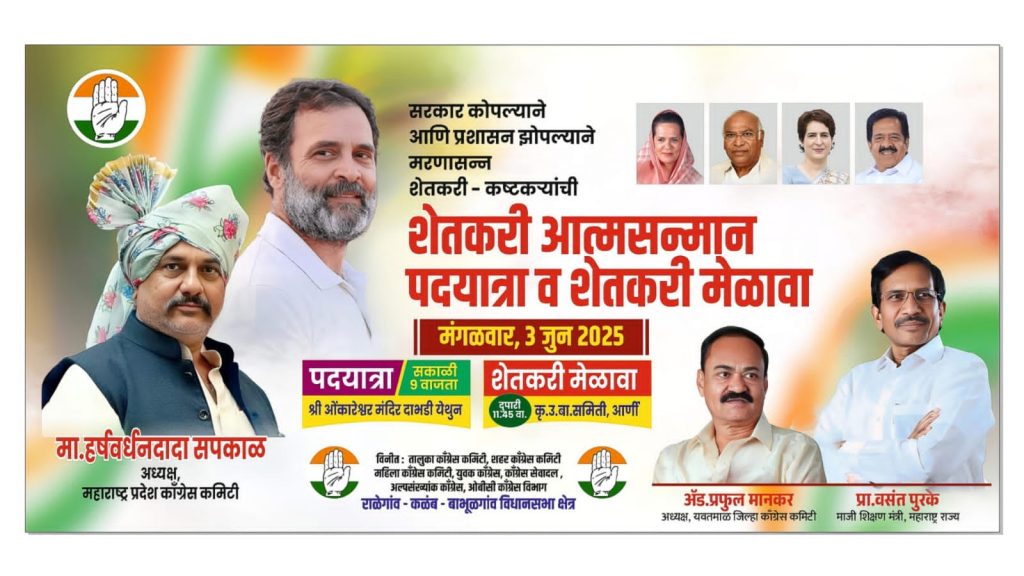 आपल्या देशाचे पंतप्रधान मा. नरेंद्र मोदी यांनी 2014 मध्ये निवडणुकीच्या तोंडावर आर्णी तालुक्यातील दाभाडी येथे देशातील शेतकऱ्यांना चाय पे चर्चा हा कार्यक्रम घेऊन भरमसाठ आश्वासने दिली होती परंतु या आश्वासनाची या सरकारने आजतागायत पुर्तता केली नाही म्हणून या दाभाडी या गावापासून येत्या 3 जूनला शेतकरी आत्मसन्मान पदयात्रा काढण्यात येणार असून ही पदयात्रा भारतीय राष्ट्रीय काँग्रेस पक्षाचे प्रदेशाध्यक्ष हर्षवर्धन सपकाळ यांच्या उपस्थितीत निघणार असून ही पद यात्रा ओंकारेश्वर मंदिर दाभाडी येथून निघणार असून या यात्रेचा समारोप कृषी उत्पन्न बाजार समिती आर्णी येथे मेळाव्याच्या स्वरुपाने होणार आहे.या सन्मान यात्रेत शेतकऱ्यांना संपूर्ण कर्जमाफी, शेतमालाला हमी भाव, सरसकट पिकविमा, शेतकऱ्यांना मोफत विज, वन्य प्राण्यांपासून पिकांचे संरक्षण करण्यासाठी काटेरी ताराचे कुंपण, कृषी पंपाचा बंद केलेला विजपुरवठा पूर्ववत सुरू करण्यात यावा, या सह अनेक मागण्यांसाठी हे आयोजन यवतमाळ जिल्हा भारतीय राष्ट्रीय काँग्रेस पक्षाच्या वतीने आयोजित करण्यात आले असून कांग्रेस पक्षाचे प्रदेशाध्यक्ष हर्षवर्धन सपकाळ यांचा हा दौरा या निमित्ताने यवतमाळ जिल्हात प्रथमच होणार असून या कार्यक्रमाच्या निमित्ताने यवतमाळ जिल्ह्यातील भारतीय राष्ट्रीय काँग्रेस पक्षाच्या सर्व पदाधिकारी सर्वसामान्य कार्यकर्त्यांत नवचैतन्य निर्माण झाले असून ही आत्मसन्मान यात्रा यशस्वी करण्यासाठी भारतीय राष्ट्रीय काँग्रेस पक्षाचे यवतमाळ जिल्हा अध्यक्ष अँड प्रफुल्ल मानकर माजी मंत्री शिवाजीराव मोघे, माजी शिक्षणमंत्री प्राध्यापक वसंतराव पुरके सर, कांग्रेस पक्षाचे ओबीसी सेलचे जिल्हाध्यक्ष अरविंद वाढोणकर, यांच्या सह अनेक मान्यवर प्रयत्न करत असून या कार्यक्रमाला उपस्थित राहण्याबाबत सर्व शेतकऱ्यांना आवाहन करण्यासाठी राळेगाव येथील खरेदी विक्री संघाच्या कार्यालयात दिनांक 30 मे ला पत्रकार परिषद आयोजित करण्यात आली होती या पत्रकार परिषदेला माजी शिक्षणमंत्री प्राध्यापक वसंतराव पुरके सर, ओबीसी सेलचे जिल्हाध्यक्ष अरविंद वाढोणकर भारतीय राष्ट्रीय काँग्रेस पक्षाचे राळेगाव तालुका अध्यक्ष राजेंद्र तेलंगे, शहराध्यक्ष प्रदीप ठुणे, खरेदी विक्री संघाचे अध्यक्ष मिलिंद इंगोले उपाध्यक्ष भरत पाल, वसंत जिनिंगचे अध्यक्ष नंदकुमार गांधी उपाध्यक्ष अंकुश रोहणकार, कृषी उत्पन्न बाजार समितीचे संचालक दिपक देशमुख, अंकुश मुनेश्वर, अंकित कटारिया,प्रकाश पोपट गोविंदा चहांदकर, श्रीधर थुटुरकर सर किशोर धामंदे अनिल देशमुख श्रावणसिंग वडते सर गजानन पुरोहित नितीन खडसे गजानन पाल अफसर अली गणेश नेहारे महादेव मेश्राम यांच्