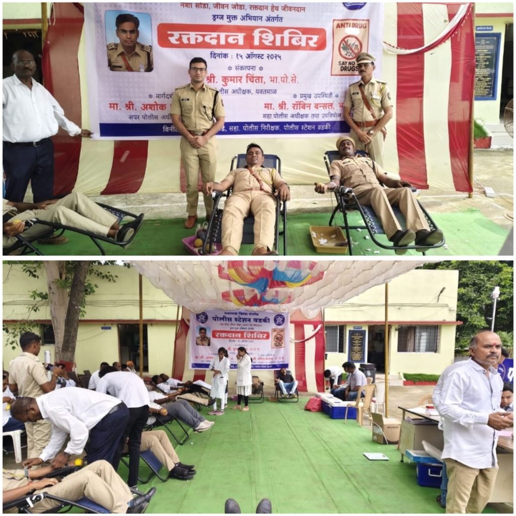 स्वातंत्र्य दिनाचे औचित्य साधून पोलीस स्टेशन वडकी येथे ड्रग्ज मुक्त अभियान अंतर्गत भव्य रक्तदान शिबिराचे आयोजन करण्यात आले. या शिबिराकरिता श्री. वसंतराव नाईक शासकीय महाविद्यालय, यवतमाळ येथील रक्तपेढी विभागातील पथकाने रक्तसंकलनाची जबाबदारी सांभाळली.
