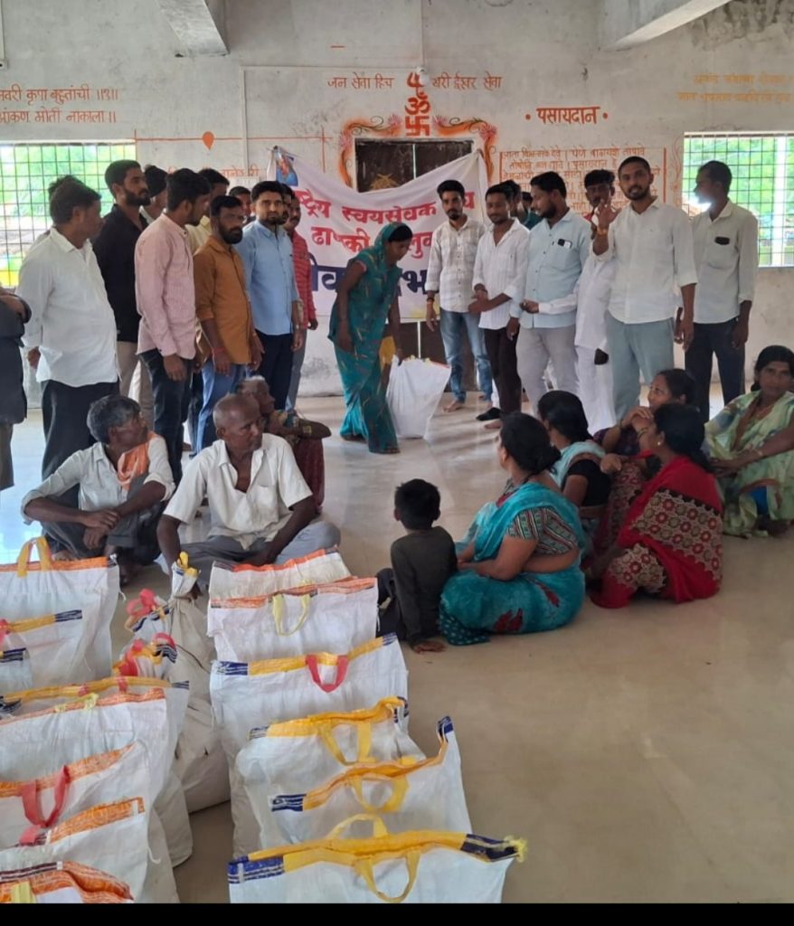 दिनांक१६ ऑगस्ट ते २० पर्यंत संतधार पाऊस होता यामध्ये अनेक काबाडकष्ट करणाऱ्यांचे घर वाहून गेले शेतं खरडून गेली व रोजचे खायला लागणारे अन्नधान्य सुद्धा भिजल्या गेले होते. त्यामुळे अनेकांना रोज जो आहार लागतो तो सुद्धा मिळणे दुर्लभ झाले होते. अनेक जण आले पाहणी केली आणि निघून गेले. पण मदतीचा शब्द जो दिला होता त्यात अनेकांना विसर पडला की काय असे वाटत असताना राष्ट्रीय स्वयंसेवक संघाने मात्र ज्या ठिकाणी संकट त्या ठिकाणी संघाचे स्वयंसेवक आले नाही व त्यांनी मदत केली नाही अस शक्यच नाही त्या अनुषंगाने दराटी३८, कोर्टा ४५, चिखली ५७, भवानी १६ घडोळी ५ नारळी ४० या ठिकाणी दैनंदिन लागणाऱ्या वस्तूंचा संच बाधित असलेल्या गरजवंतांना २२ ऑगस्ट शुक्रवारला पोळा सणाच्या दिवशी ही मदत देऊन एक दिव्य काम केले. गरजूंना मदत करणे हेच संघाचे ध्येयधोरण राहिले आहे. आणि तेच काम आजच्या कृती कर्मा मधून दिसून पडते.. कोणत्याही प्रकारचा मनी स्वार्थ न बाळगता हव्यासाच्या कोसो दूर राहून संघाची ही वाटचाल थक्क करणारी राहिलेली आहे.यात कार्यकर्ता न राहता संघाने एक पायंडा पाडून दिला तो म्हणजे “स्वयंसेवक” म्हणून राहिले पाहिजे. हा कानमंत्र आजही स्वयंसेवक जतन संवर्धन करून कार्य करतात .आजही कार्यकर्ता म्हणून नाही तर एक स्वयंसेवक म्हणून, एखादे काम स्वयंसेवकांनी हाती घेतल्यानंतर ते कधीच अंगुली निर्देश न करता स्वतः हा कोणत्याही प्रकारचा आपल्याला फायदा न बघता केवळ कर्तव्य हेच ध्येय कर्म मानून काम करतात.आणि संघाने जे स्वयंसेवकावर संस्कार केले तो कधी विसरला नाही कितीही प्रसंग कठीण असला तरी तो तडजोड करून संस्काराला छेद न देता अविरतपणे काम करत राहिला हे विशेष. स्वयंसेवकांची सेवा ही वाखण्याजोगी आहे म्हणूनच संघाचे आचार विचार टिकून आहेत. कधी ही स्वयंसेवक हव्यासापोटी लालसेपोटी नको त्या दाराला अथवा ओघात वाहून गेला नाही. स्वतःची आर्थिक वृध्दी व्हावी म्हणून कधीही विचाराचा उपयोग करून लाभ घेतला गेला नाही. हे अनेक दशकापासूनच्या चालत आलेल्या वाटचालीत बघायला मिळाले म्हणूनच हे कार्य अखंडित व अविरत चालू आहे.