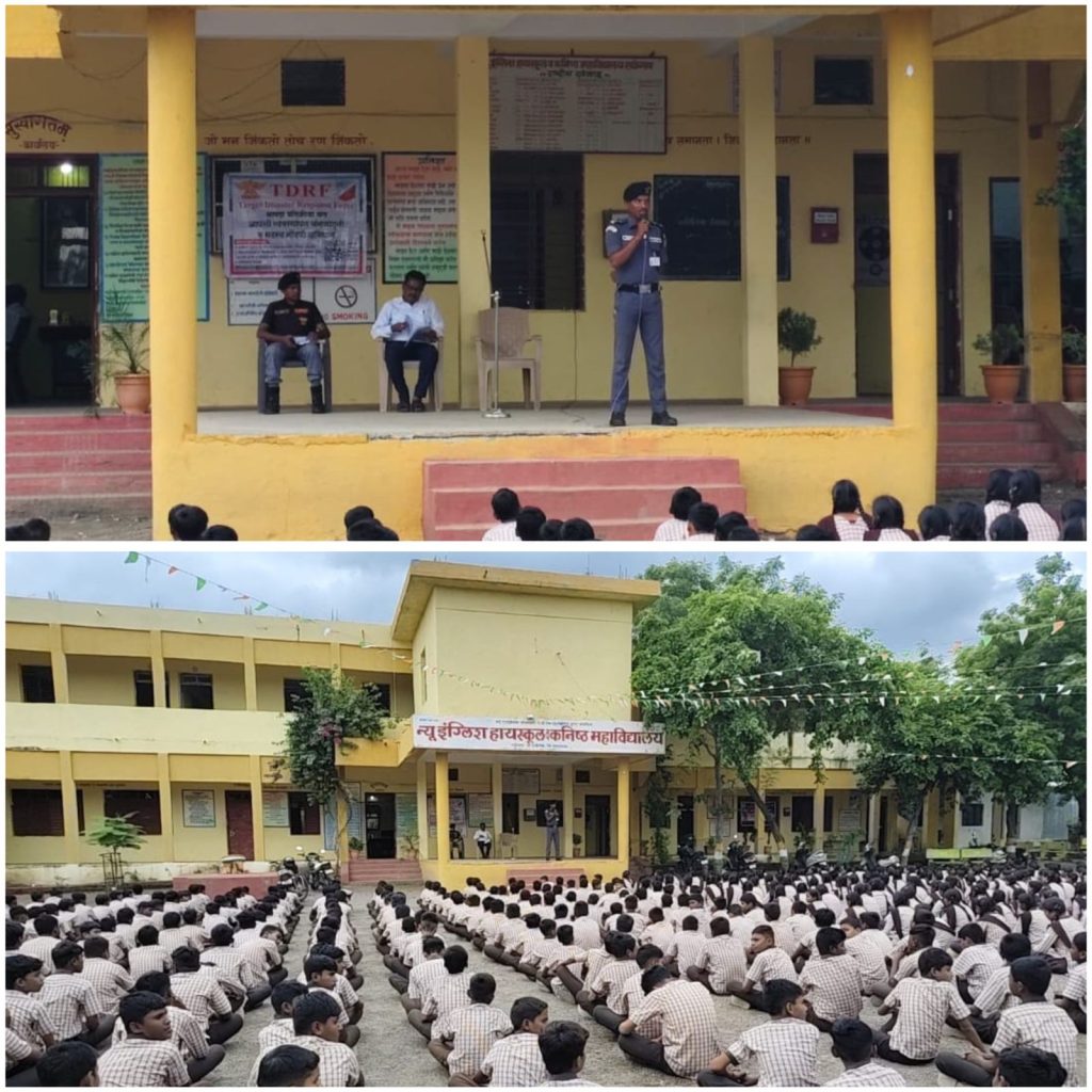 न्यू इंग्लिश हायस्कूल येथे दिनांक 27 ऑगस्ट रोजी टी. डी.आर. एफ… (राष्ट्रीय आपत्ती व्यवस्थापन विभाग ) यांच्या युनिट ने शाळेतील सर्व विद्यार्थ्यांना संकट काळात अचानक आग लागणे,भुकंप होणे, तसेच वेगवेगळ्या नैसर्गिक आपत्ती काळात विद्यार्थ्यांनी कशी काळजी घ्यावी.व स्वतःची तसेच इतरांचे जीवन कसे वाचवावे याबद्दल प्रत्यक्ष मॉक ड्रिल सादर केले.यावेळी शाळेतील 1680 विदयार्थ्यांना आपत्ती व्यवस्थापन याबद्दल माहिती दिली. या सर्व आपत्ती व्यवस्थापन माहिती बद्दल शाळेतील विद्यार्थ्यां मध्ये मोठा उत्साह दिसून आला .या आपत्ती व्यवस्थापन कार्यशाळे करिता शाळेचे मुख्याध्यापक विजय कचरे, उपमुख्याध्यापक सुरेश कोवे, पर्यवेक्षक सूचित बेहरे तसेच शाळेतील आपत्ती व्यवस्थापन प्रभारी शिक्षक तसेच शाळेतील इतर सर्व शिक्षक,शिक्षिका व विद्यार्थी सहकार्य केले.
