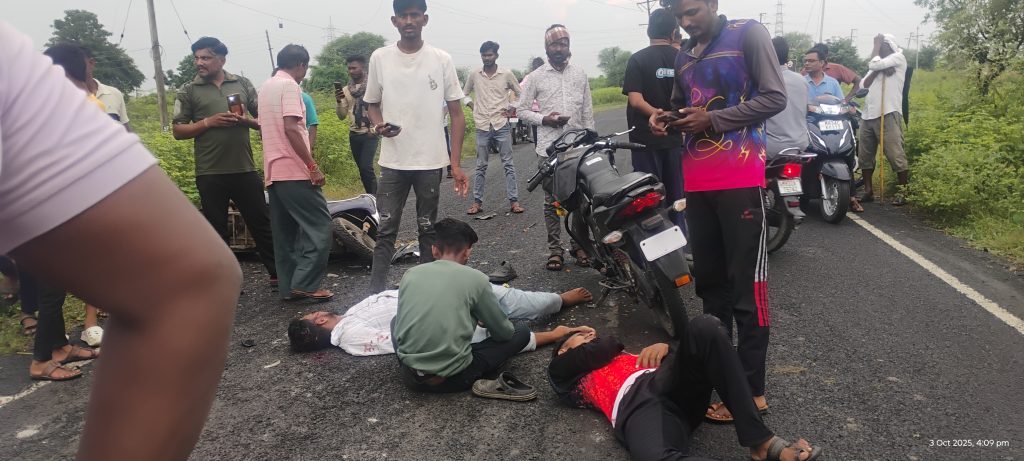 वरोरा शहरातून पिरली कडे जाणाऱ्या दुचाकीची चंदनखेडा येथून येत असलेल्या दुचाकीसोबत समोरासमोर धडक झाल्याने चौघे गंभीर जखमीं झाले .आहे .जखमींपैकी एकाच्या पाय फ्रॅक्चर झाला असून एकाचा डोक्याला गंभीर दुखापत झाली आहे .तर दोघे मात्र किरकोळ दुखापत झाली आहे . विसर्जन असल्याने. शिरणा नदी , जामगाव येथे पोलिसांची नियुक्ती होती .त्याच पुलावर समोरासमोर धडक झाली. गाडी क्रमांक MH 34CA 1566 मोपेड गाडी ची पॅशन प्रो MH 34 BQ 7733 ची समोरासमोर जबर धडक झाल्याने एकाला बाजूला असलेल्या झाडीत फेकला गेला तर एक चालक रस्त्यावरच पडला त्यामुळे डोक्याला जबर दुखापत झाली .
