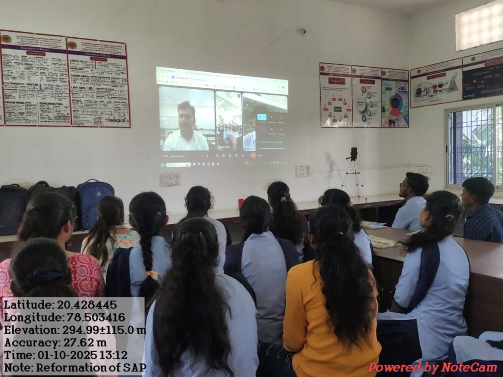 या व्याख्यानासाठी प्रमुख वक्ते म्हणून डॉ. एस. आर. जैसवाल, सहाय्यक प्राध्यापक, आर. एल. टी. कॉलेज ऑफ सायन्स, अकोला हे उपस्थित होते. त्यांनी आपल्या सखोल व प्रेरणादायी व्याख्यानातून अवकाशविज्ञानाची मूलभूत तत्त्वे, उपग्रह व प्रक्षेपण तंत्रज्ञान, अवकाशातील नवीन संशोधन याबाबत सविस्तर मार्गदर्शन केले. विशेषत: भारतीय अंतराळ संशोधन संस्थेची (ISRO) कामगिरी व तरुण संशोधकांसाठी असलेल्या संधींवर त्यांनी भर दिला. या कार्यक्रमाचे अध्यक्षस्थान डॉ. ए. वाय. शेख यांनी भूषविले. प्रमुख पाहुणे म्हणून डॉ. के. डी. जगताप गणित विभागाचे प्राध्यापक डॉ. एस. व्हि. गोरे यांनी उपस्थित राहून विद्यार्थ्यांना अशा उपक्रमांमध्ये सहभाग घेण्याचे आवाहन केले. कार्यक्रमाचे आयोजन व सूत्रसंचालन डॉ. बी. एच. भट्टी यांनी केले. या संवादात्मक सत्रामुळे विद्यार्थ्यांना अवकाशविज्ञान क्षेत्रातील गुंतागुंतीचे विषय सुलभ पद्धतीने समजून घेता आले. समारंभाच्या शेवटी ए. एस. लिहितकर यांनी मान्यवरांचे तसेच उपस्थित प्राध्यापक व विद्यार्थ्यांचे आभार मानून कार्यक्रमाची सांगता केली. या व्याख्यानामुळे विद्यार्थ्यांमध्ये विज्ञानाविषयीची जिज्ञासा वाढून संशोधन व नवोपक्रमाकडे त्यांचा कल अधिक दृढ होईल, असा विश्वास मान्यवरांनी व्यक्त केला.