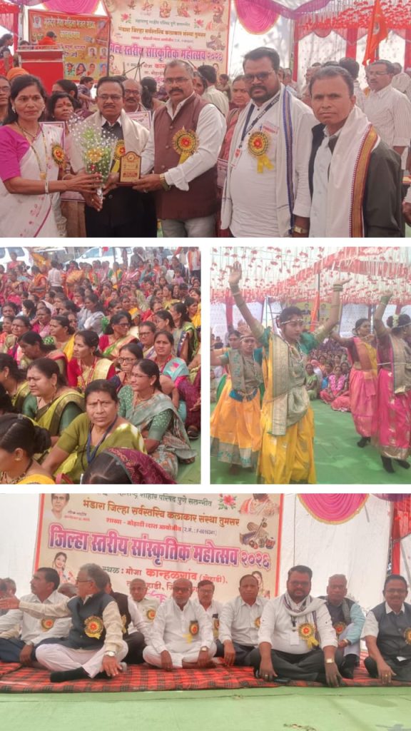 भंडारा -महाराष्ट्र शाहीर परिषद पुणे संलग्नित भंडारा जिल्हा सर्व स्तरीय कलाकार संस्था तुमसर तालुका शाखा मोहाडी च्या वतीने जिल्हास्तरीय सांस्कृतिक भव्य महोत्सवाचे आयोजन मोहाडी तालुक्यातील कान्हाळगाव येथे 10 व 11 जानेवारी 2026 ला रोज शनिवार व रविवारला जिल्हा परिषद प्राथमिक शाळा च्या पटांगणावर आयोजित करण्यात आले होते . कार्यक्रमाचे उद्घाटन जागेश्वर मेश्राम सरपंच कान्हाळगाव यांचे हस्ते करण्यात आले . यावेळी प्रमुख अतिथी म्हणून खुशाल कोसरे सदस्य मानधन समिती भंडारा, मदन शेंडे सदस्य मानधन समिती भंडारा ,महेंद्र वाहने माजी सदस्य मानधन समिती भंडारा, बाळू बोबडे, कांचनताई निंबार्ते, मुन्ना निंबार्ते,शिवशंकर सव्वालाखे ,सुनील चवळे ,डॉ.पुरुषोत्तम बोंद्रे सचिव गांधर्व कलाकार संस्था , रंगराज खराबे सदस्य मानधन समिती नागपूर, मारुती निंबार्ते, शाहीर अरुण मेश्राम, प्रेस संपादक व पत्रकार सेवा संघटनेचे राज्य सरचिटणीस संजीव भांबोरे, पत्रकार तथा भीमशिहीर प्रदीप कडबे, यावेळी प्रामुख्याने उपस्थित होते. यावेळी सर्व पाहुण्यांच्या उपस्थितीत अण्णाभाऊ साठे ,डॉ.बाबासाहेब आंबेडकर, छत्रपती शिवाजी महाराज, यांना अभिवादन करून व स्वागत गीताने कार्यक्रमाची सुरुवात करण्यात आली. त्यानंतर सर्व पाहुण्यांचे पुष्पगुच्छ देऊन स्वागत करण्यात आले. सदर कार्यक्रमात सामाजिक कार्यकर्ते तथा पत्रकार संजीव भांबोरे व पत्रकार तथा भीमशाहीर प्रदीप कडबे यांच्या शाल,पुष्प, सन्मानचिन्ह, व सन्मानपत्र, देऊन मान्यवरांच्या उपस्थितीत सत्कार करण्यात आला. त्याचप्रमाणे सहभागी सर्व कलाकार यांना सुद्धा प्रमाणपत्र व सन्मानचिन्ह देऊन सन्मानित करण्यात आले. कार्यक्रमाचे प्रास्ताविक गणेशराम देशमुख संस्थाध्यक्ष यांनी केले. या दोन दिवसीय कार्यक्रमात कलाकारांनी नाटक, तमाशा, गोंधळ, भारुड कलापथक, दंडार ,कीर्तन, भजन, डहाका, गायन ,वादन ,नकलाकार ,नृत्य , शाहीर,पोवाडा. विविध सांस्कृतिक सादर करण्यात आले.कार्यक्रम यशस्वी करण्याकरता प्यारेलाल उचीबगले अध्यक्ष प्रतिष्ठान कलावंत प्रतिष्ठान भंडारा,,वसंत कुंभरे ,घनश्याम पठारे ,मधुकर फुलबांधे ,मंगेश मानापुरे, अशोक बुधे, गीता रामटेके ,नरेश देशमुख, राजूभाऊ गजभिये, मनराज भुरे ,मारुती निंबार्ते,श्रीमती कल्पना कामथे,प्रभाताई पाटील ,शिला झंजाळ, मारुती निंबार्ते, दुर्वास बावणे, दुर्गादास बावणे भरत नागोसे ,निलकमलबाई गोंडाणे ,सुषमा टिचकुले , यांनी सहकार्य केले.