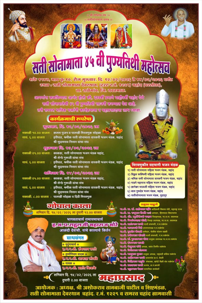 राळेगाव तालुक्यातील भाविक भक्तांचे श्रद्धास्थान असलेल्या अवलिया सती सोनामातेची पुण्यतिथी सोहळा राळेगाव तालुक्यातील चहांद परसोडा येथे मोठ्या उत्साहात दरवर्षी सर्व भाविक भक्तांच्या वतीने साजरी करण्यात येत असून दरवर्षी प्रमाणे याही वर्षी सती सोनामातेची 45 वी पुण्यतिथी सोहळ्याचे दिनांक 12/2/2026 पासून आयोजन करण्यात आले असून तो सोहळा 14/2/2026 पर्यंत चालणार असून या सोहळ्याची सांगता दिनांक 14/2/2026 रोजी होणार आहे.या पुण्यतिथीची कार्यक्रमाची रूपरेषा अशाप्रकारे असून दिनांक 12/2/2026 रोजी सायंकाळी सकाळी ठिक 10.00 वाजता कलश पुजन व पालखी मिरवणूक सोहळा पार पडणार असून सायंकाळी 6.00 वाजता श्रमिक सती सोनामाता वारकरी भजन मंडळ चहांद येथील श्री सुदामराव निसार यांच्या मंडळाच्या माध्यमातून हरीपाठाचे सादरीकरण करण्यात येणार आहे.त्यानंतर 13/2/2026 रोज शुक्रवारला सकाळी ठिक 5.00 वाजता सती सोनामाता भजन मंडळ चहांद परसोडा व श्री शेंडे गुरूजी यांच्या मंडळाद्वारे काकड्याचे सादरीकरण करण्यात येणार असून सायंकाळी 6.00 वाजता श्रमिक सती सोनामाता वारकरी भजन मंडळ चहांद परसोडा यांचे हरिपाठाचे आयोजन करण्यात येणार आहे.तर कार्यक्रमाचे शेवटच्या दिवशी दिनांक 14/2/2026 रोज शनिवारला सकाळी 5.00 वाजता सती सोनामाता भजन मंडळ चहांद यांचे काकड्याचे सादरीकरण करण्यात येणार आहे तर सायंकाळी 6.00 वाजता श्रमिक सती सोनामाता वारकरी भजन मंडळ चहांद परसोडा व सुदामराव निसार यांचे हरिपाठाचे सादरीकरण करण्यात येणार आहे.तर सायंकाळी 8.00 वाजता पालखी सोहळा व दिंडी मिरवणूक सोहळा पार पडणार आहे.तर याच दिवशी दुपारी 12 वाजता गोपाळ काल्याचे आयोजन करण्यात आले आहे.तर आळंदी देवाची येथील भागवताचार्य रामायणाचार्य हे.भ.प. राहुलजी मोरे महाराज यांच्या काल्याच्या किर्तनाचे आयोजन करण्यात आले आहे.या किर्तनात साथ संगत ह. भ.प. शंकरराव सराटे यांची मृदुंगाची साथ मिळणार असून ही.भ.प. आकाशजी लोखंडे यांची हार्मोनियमची साथ मिळणार आहे तर ह.भ.प. प्रशांत किन्नाके यांचे गायन सादर करण्यात येणार आहे.या कार्यक्रमाला प्रमुख पाहुणे म्हणून महाराष्ट्राचे आदिवासी विकास मंत्री प्राचार्य अशोकराव उईके सर उपस्थित राहणार असून सोबतच माजी आमदार राजूभाऊ तिमांडे, अँड.प्रफुलभाऊ चव्हाण चित्तरंजजी कोल्हे, प्रशांत तायडे,जानरावजी गिरी, ठाणेदार सुखदेवराव भोरखेडे , प्रविण कोकाटे, डॉ.कुणाल भोयर,संजय काकडे, नंदकुमार गांधी, विनोद मांडवकर,बाळुभाऊ धुमाळ, आशिष पारधी, जितेंद्र कहुरके , प्रसाद ठाकरे, राहुल मेश्राम या मान्यवर मंडळीची उपस्थिती राहणार असल्याचे युवा नेतृत्व चारूदत्त अशोकराव पाटील यांनी प्रसिद्धी पत्रकाद्वारे कळविले आहे.