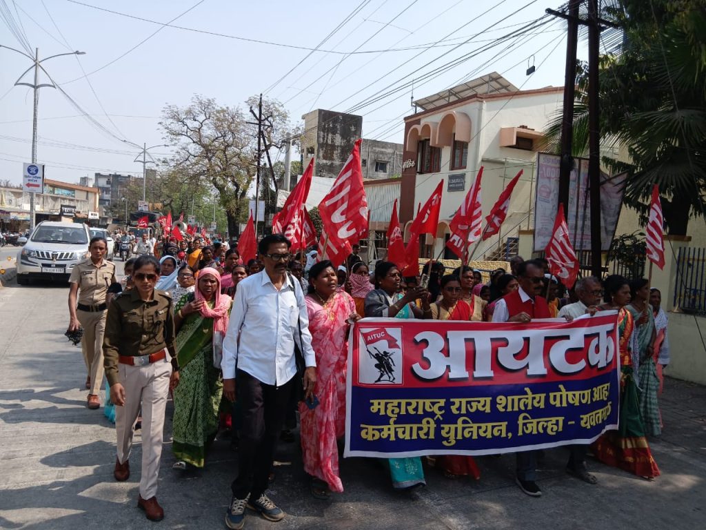 आयटकसह केद्रीय कामगार संघटनांनी दिलेल्या देशव्यापी संपाचे हाकेनुसार स्थानिक श्रमशक्ती भवन यवतमाळ येथुन निघालेला मोर्चा जिल्हा परिषद मार्गे,संविधान चौक ,दत्त चौक, नेताजी मार्केट , पाच कंदली चौकातुन, महात्मा ज्योतिबा फुले यांचे पुतळा जवळून, महादेव मंदिरमार्गे मार्गक्रमण करत कामगार विरोधी धोरणाचे विरोधात घोषणा देत शहरवासीयांचे लक्ष केंद्रित करत मोर्चा आयटक च्या नेतृत्वात यवतमाळ जिल्हाधिकारी कार्यालयावर धडकला. केंद्र सरकार व्दारे लागु श्रमिक विरोधी ४ श्रम सहीता लागु करणे संबंधी दि.२१ नोव्हेंबर २०२५ रोजी अचानक जारी केलेली अधिसुचना रद्द करा.यासह इतरही मागण्यांना घेऊन आयटक सह केंद्रीय कामगार संघटनांनी आज दि. १२ फेब्रुवारी २०२६ रोजी एक दिवसाचा पुकारलेल्या लाक्षणिक संपात शालेय पोषण आहार कर्मचारी युनियन व अंशकालीन स्त्री -परिचर संघटना त्यांच्या मागण्यांना घेऊन सहभागी होत्या. सातत्याने शासनाकडे (स्वयंपाकी-मदतनीस) म्हणून नाही; अंशकालीन स्त्री -परिचर म्हणून नाही; तर आम्हाला कामगार समजुन कामगार कायद्याप्रमाणे किमान वेतन द्यावे अशी मागणी करीत आलो आहोत.परंतू शासन या कडे दुर्लक्ष करीत आहे. राज्यातील प्रधान मंत्री पोषण शक्ती निर्माण योजना अंतर्गत कार्यरत स्वयंपाकी-मदतनीस यांच्या मानधनात दरमहा रू.१०००/-( एक हजार) मानधन वाढ देण्याचे मान्य करून सुद्धा शासनाने पुर्तता केलेली नाही. त्याच प्रमाणे आरोग्य खात्यातील अंशकालीन स्त्री -परिचर यांच्या मानधन वाढीचा प्रस्ताव राज्य शासनाकडे प्रलंबित आहे त्याचीही अमंलबजावणी नाही शासनाने कामगारांच्या हिताचे कामगार कायदे मोडून त्यांना वेठबिगारी सारखे जिवन जगायला भाग पाडु नये.मानविय दुष्टीने विचार करून सर्व श्रेत्रातील कामगारांना किमान वेतन द्यावे. अशी आम्ही मागणी करीत आहोत. सध्या स्वयंपाकी मदतनीस यांना केंद्र सरकार दरमहा रू.६००/- व राज्य सरकार रू.१९००/- असे एकुण रू.२५००/- मानधन देत आहे. तसेच अंशकालीन स्त्री -परिचर यांना केंद्र सरकार दरमहा रू.१००/- तर राज्य सरकार रू.२९००/- असे एकुण रू. ३००० /-देत आहे या जिवघेण्या महागाईत येवढ्या तुटपुंज्या मानधनात कसे जगायचे हा आमच्या समोर यक्ष प्रश्न आहे. तेव्हा केंद्र व राज्य शासनाने श्रमिक विरोधी ४ श्रम सहीता रद्द कराव्या, श्रमीकांना सार्वभौमिक सामाजिक सुरक्षा प्रदान करा,अंघीटीत कामगारांना किमान वेतन रू.२६०००/- द्या , पुर्वीपासुनचे कामगार कायदे कायम ठेवा या मुख्य मागण्या सह इतरही मागण्याचे निवेदन पंतप्रधान ,नई दिल्ली व मुख्यमंत्री ,महाराष्ट्र राज्य मुंबई यांना जिल्हाधिकारी यवतमाळ यांचे मार्फत पाठविण्यात आले आहे. मागण्या १) दि. १८ डिसेंबर २०२३ रोजी काढलेल्या आक्रोश मोर्चा 