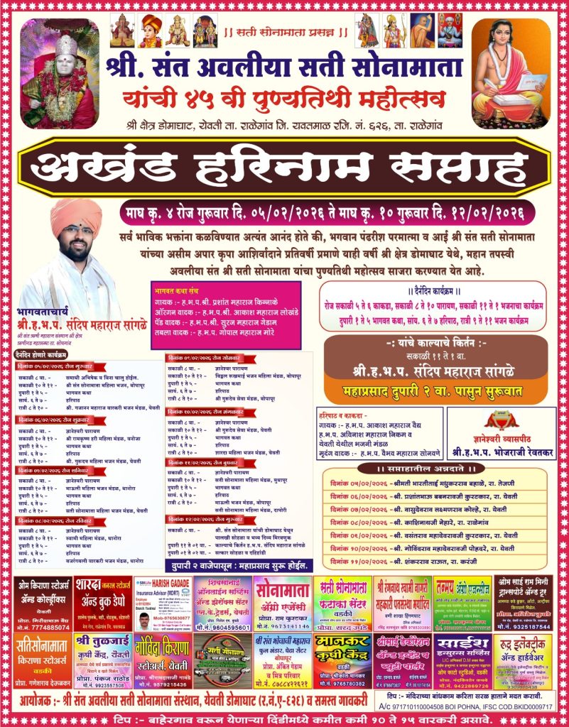या अखंड हरिनाम सप्ताहाला श्री संत ऋषी महाराज संस्थान श्री क्षेत्र ऋषी गड महालब्ध तालुका सोयगाव हे लाभले असून आज सकाळी ८:०० वाजता श्री संत सोनामाता यांची डोमाघाट येथून पालखी सोहळा व भव्य दिव्य मिरवणूक निघणार आहे त्यानंतर दुपारी ११:०० ते १:०० ह भ प संदीप महाराज सांगळे यांचे काल्याचे किर्तन व त्यानंतर दुपारी १ :०० ते २:०० सत्कार सोहळा व दहीहंडी त्यानंतर दुपारी २ :०० वाजता पासून महाप्रसादाला सुरुवात होईल तरी या पुण्यतिथी उत्सव सोहळ्याला व महाप्रसादाला सर्वत्र भाविक भक्तांनी तन-मन-धनाने व श्रमाने कार्यक्रमाला उपस्थित राहावे असे आवाहन अवलिया सती सोनामाता देवस्थान येवती (डोमाघाट ) व विश्वस्त समस्त येवती ग्रामवासी भाविक मंडळींनी केली आहे.